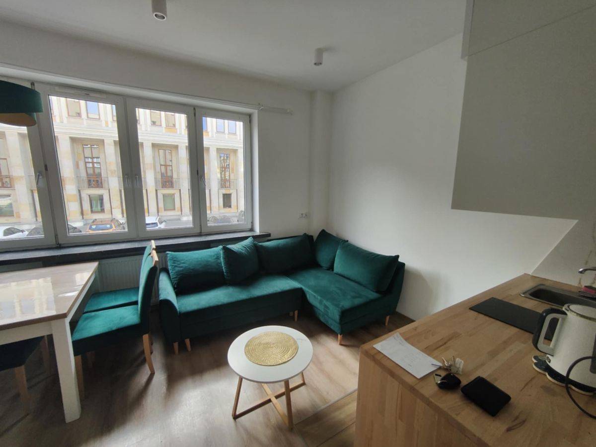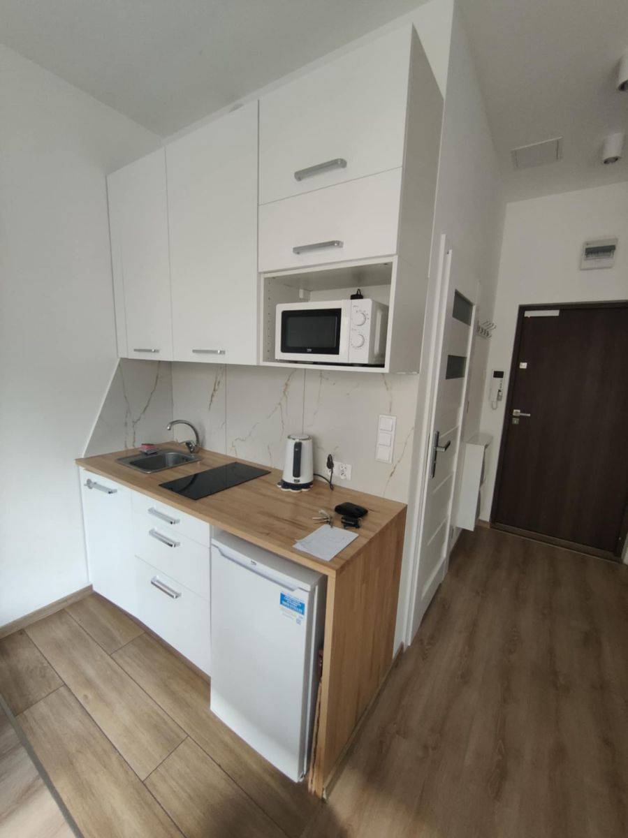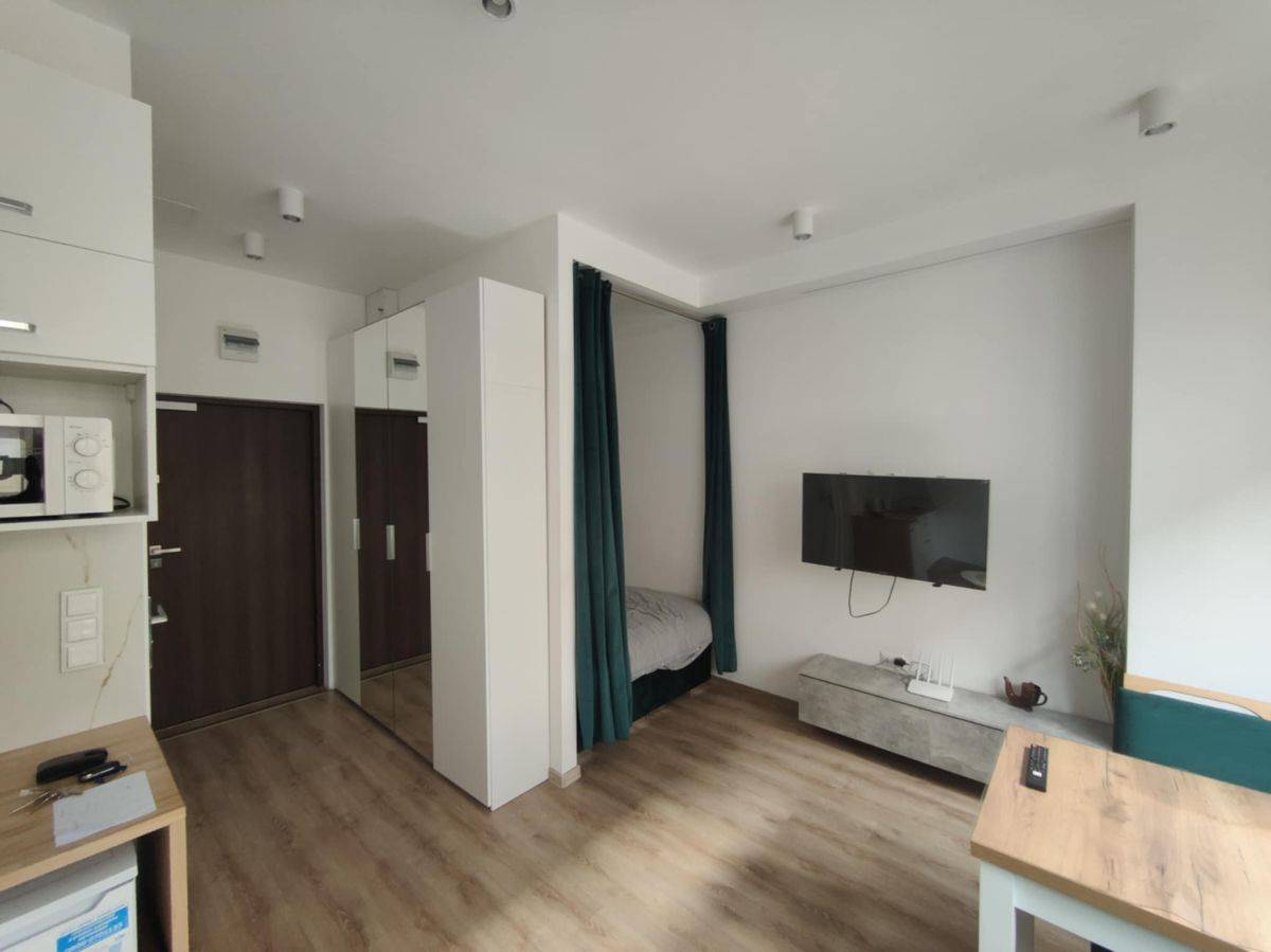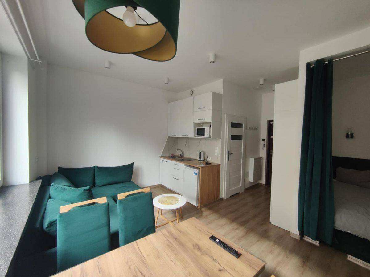 Studio jest w pełni gotowe do zamieszkania - umeblowane jak na zdjęciach i wyposażone w sprzęt agd i TV. Zabudowa kuchenna z małą płytą indukcyjną, lodówką i mikrofalówką. Umeblowanie pokoju, to rozkładana sofa, stolik kawowy, stół, 4 krzesła tapicerowane i TV, a w części sypialnej duże, wygodne łóżko za kotarą. W przedpokoju duża szafa.