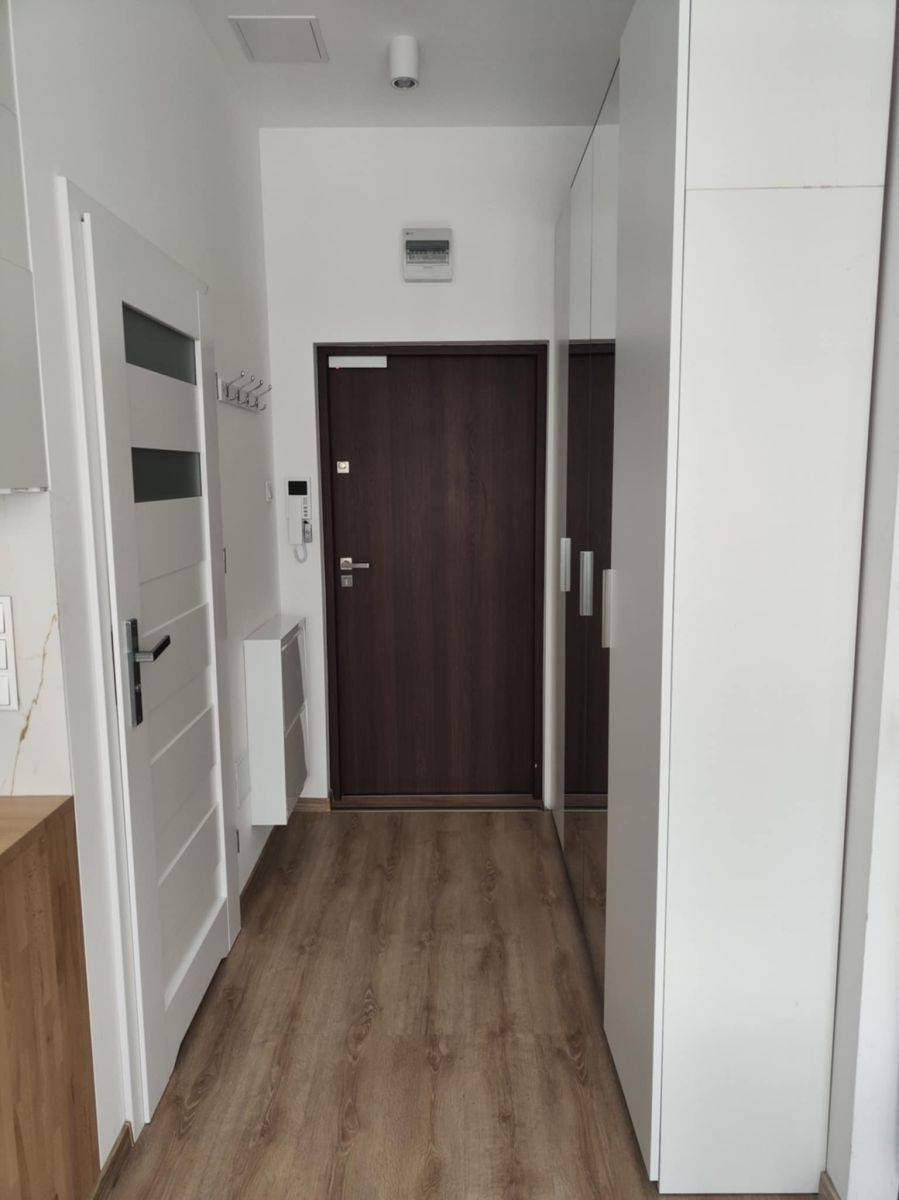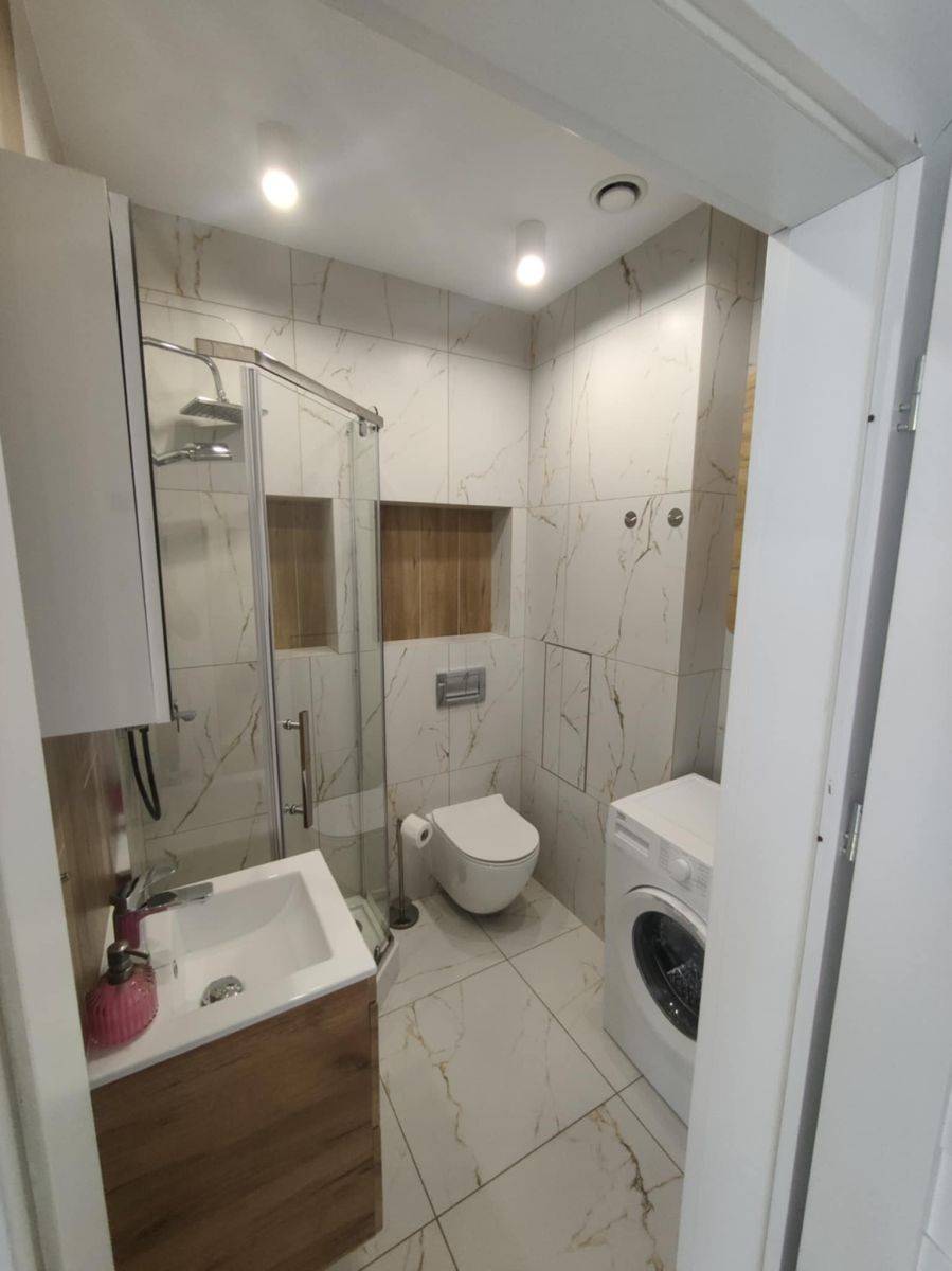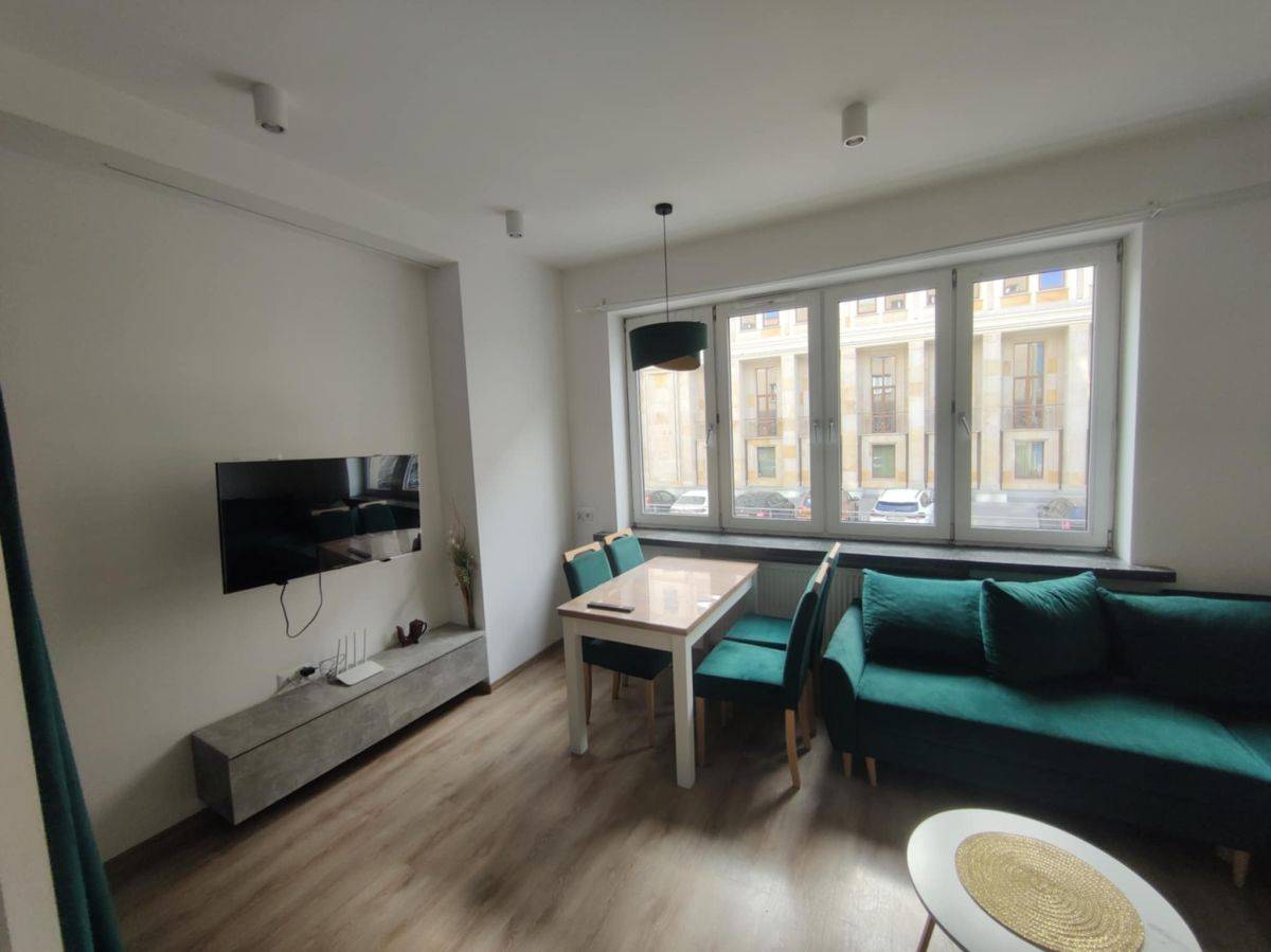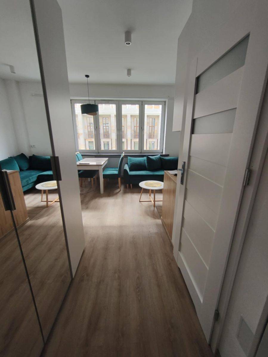 Studio jest w pełni gotowe do zamieszkania - umeblowane jak na zdjęciach i wyposażone w sprzęt agd i TV. Zabudowa kuchenna z małą płytą indukcyjną, lodówką i mikrofalówką. Umeblowanie pokoju, to rozkładana sofa, stolik kawowy, stół, 4 krzesła tapicerowane i TV, a w części sypialnej duże, wygodne łóżko za kotarą. W przedpokoju duża szafa.