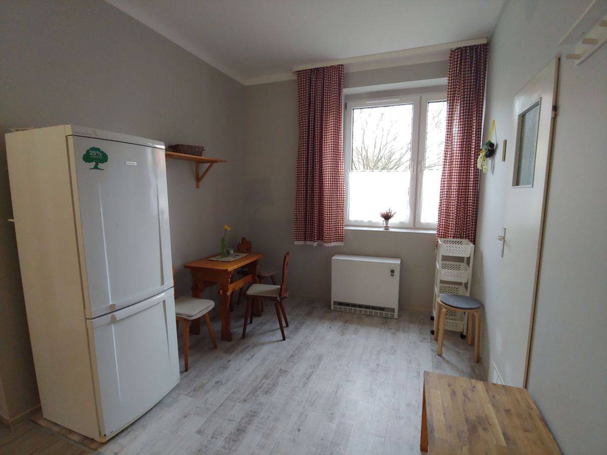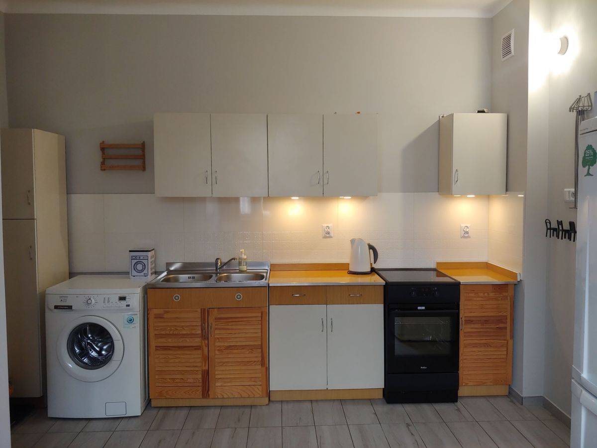 Mieszkanie jest umeblowane (w tym dwa miejsca do spania) i wyposażone w sprzęt AGD - pralka, kuchenka z płytą indukcyjną i elektrycznym piekarnikiem, duża lodówka z zamrażarką.