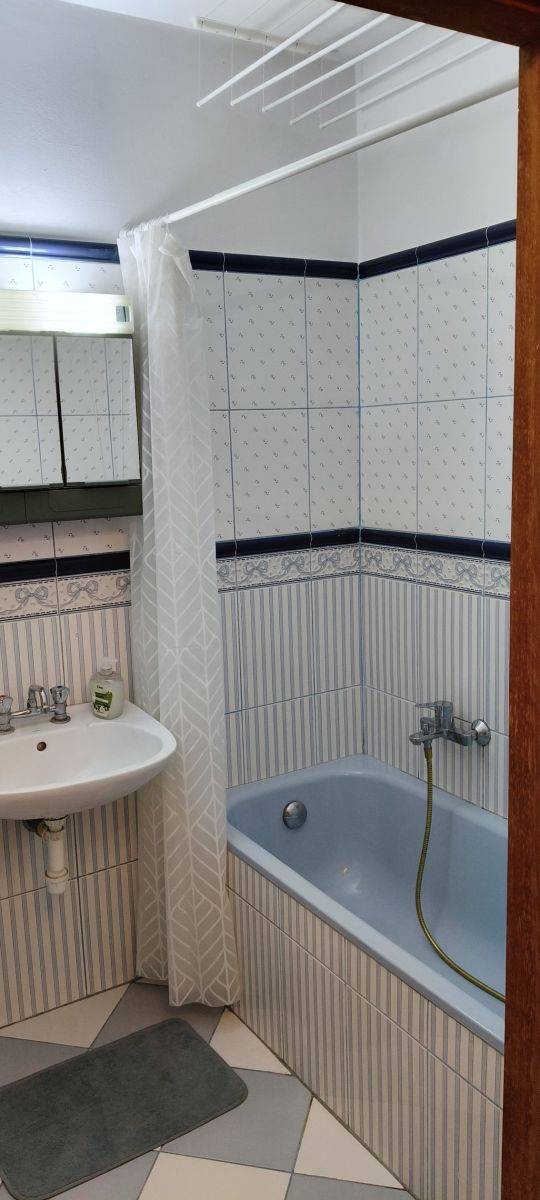 W łazience z wanną, umywalką z lustrem, ubikacją i szafką, znajduje się również pralka. Całość utrzymana w eleganckich, nowoczesnych płytkach.
