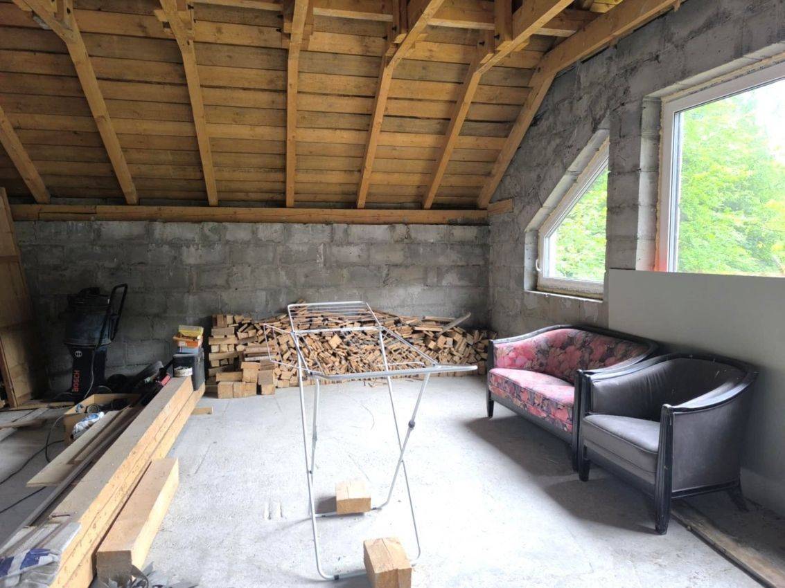 PARTER: (komunikacja) , kuchnia, łazienka do zrobienia, duży pokój, z widokiem na ogród , pokój (przechodni) nad garażem. Poddasze na chwilę obecną do wykończenia/adaptacji.