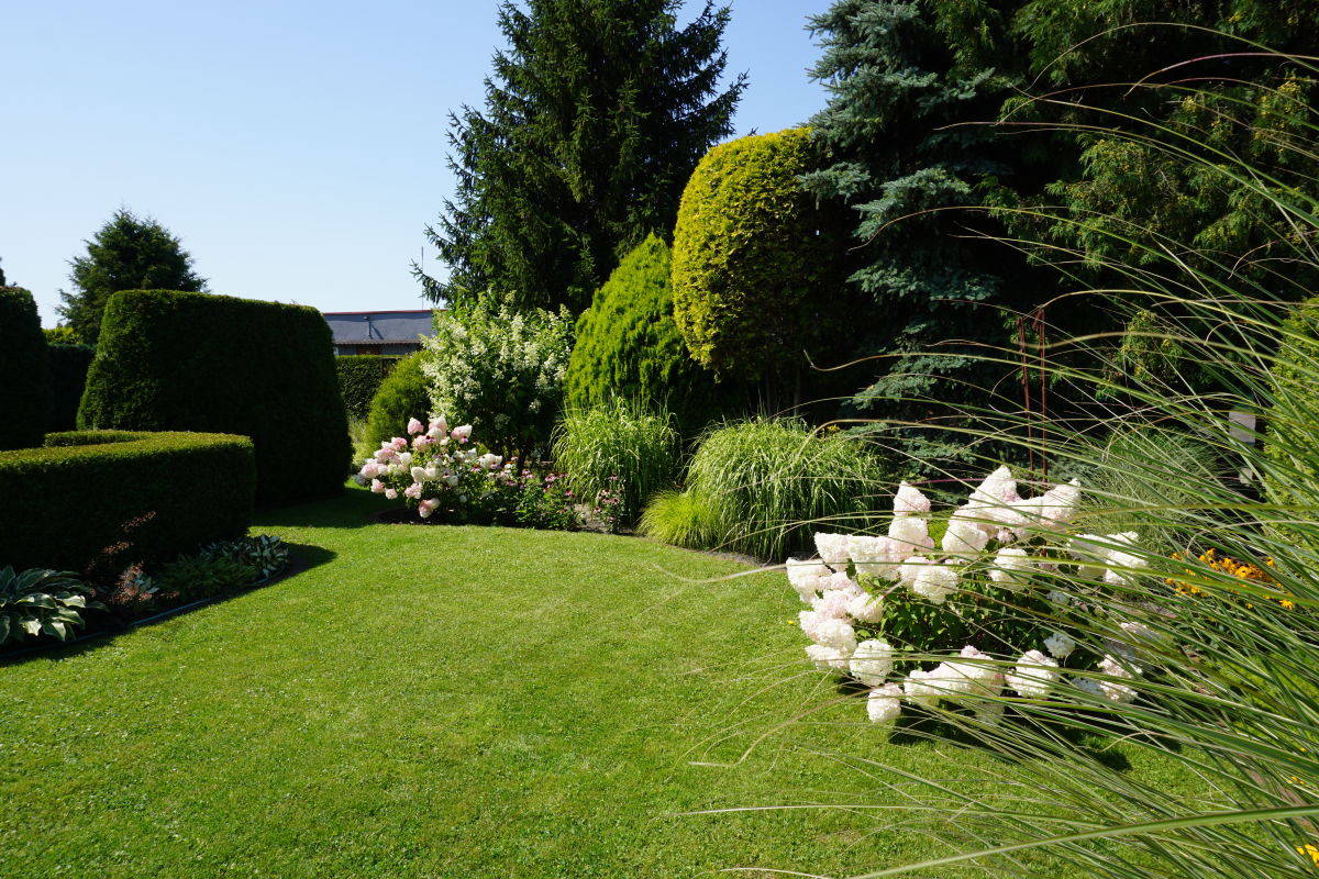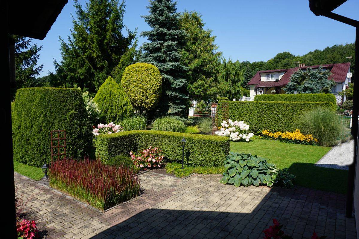 Urokliwie urządzony ogród z kolorowymi nasadzeniami i podświetleniem.