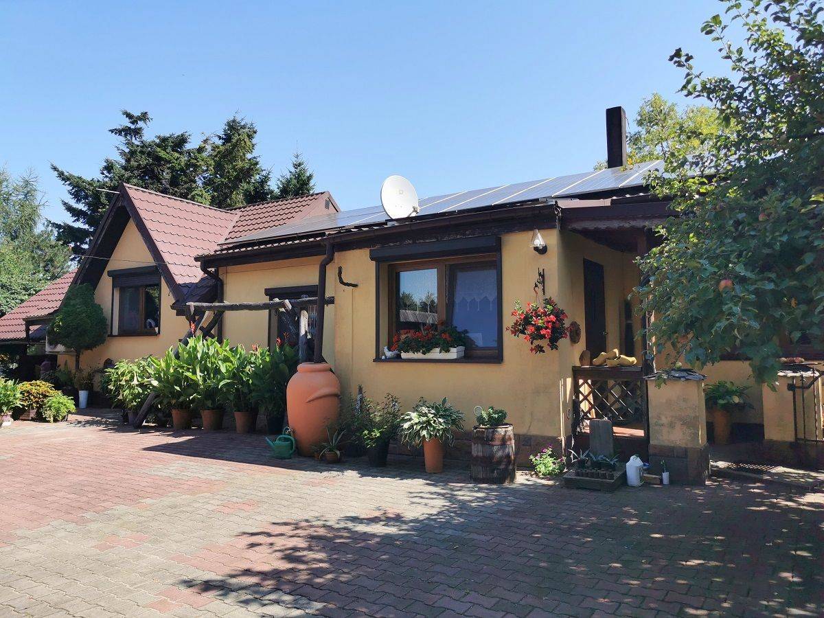 Budynek mieszkalny został wybudowany w latach 50-tych XX w, a następnie rozbudowany około r. 2000. Budynek mieszkalny jest budynkiem wybudowanym w technologii tradycyjnej, parterowym, częściowo podpiwniczonym i z poddaszem nieużytkowym (strychem). Posiada ściany zewnętrzne z cegły pełnej oraz w części dobudowanej z bloczków z betonu komórkowego (gazobetonu) oraz pustaków szczelinowych. Budynek jest ocieplony styropianem gr. 10 cm (za wyjątkiem ściany południowej). Dach posiada konstrukcję drewnianą i jest pokryty blachodachówką i docieplony wełną mineralną. W budynku mieszkalnym znajdują się następujące pomieszczenia: przedsionek (5,2 m²), hall (19,0 m²), sypialnia (11,0 m²), pokój (16,6 m²), garderoba (9,1 m²), łazienka (7,4 m²), łazienka z kotłownią (14,5 m²), pomieszczenie przechodnie (7,0 m²), kuchnia (14,5 m²) oraz pokój dzienny (33,7 m²) z przestronnym i zadaszonym tarasem od strony północnej o powierzchni 30 m². Budynek mieszkalny jest wyposażony w centralne ogrzewanie: pompę ciepła (Panasonic, ok. 3-letnią) z fotowoltaiką (10 kW, część z ok. 2021 r., a część z ok. 2023 r.), z ogrzewaniem podłogowym w łazience z kotłownią. Budynek mieszkalny jest również wyposażony w prąd (w tym siłę - na budynku mieszkalnym, w piwnicy oraz w budynku gospodarczym), wodę - z sieci gminnej (dodatkowo - studnia), kanalizację sanitarną - do zbiornika bezodpływowego, internet radiowy (światłowód przyłączony do działki sąsiedniej) i klimatyzację. Okna plastikowe 2-szybowe, około 5-letnie, zaopatrzone w rolety zewnętrzne (za wyjątkiem garderoby i łazienek) - sterowane ręcznie. Podłogi w budynku mieszkalnym: drewniane z desek dębowych i sosnowych oraz panele podłogowe i płytki ceramiczne.