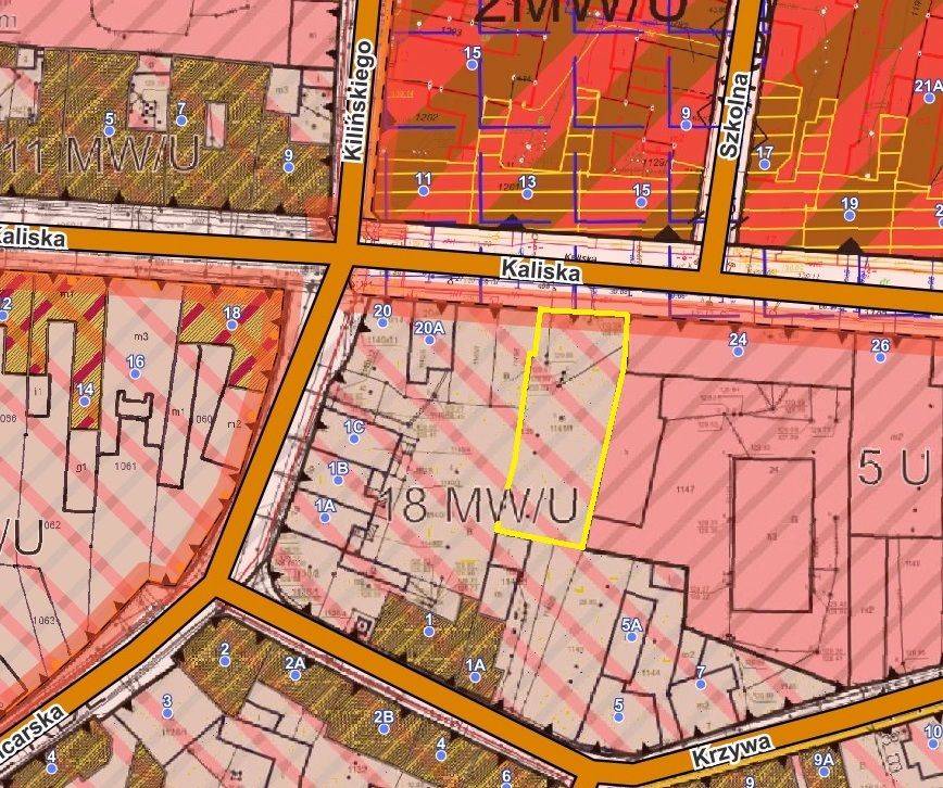 Zgodnie z obowiązującym planem miejscowym, działka jest przeznaczona pod zabudowę mieszkaniową wielorodzinną i zabudowę usługową (18MW/U), z dopuszczeniem zabudowy zwartej, pierzejowej. Dopuszczalna wysokość budynków mieszkalnych i usługowych: do 3 kondygnacji nadziemnych, w tym poddasze, z zakazem realizacji budynków o wysokości powyżej 12 m. Plan miejscowy przewiduje dla obszaru działki: 0% powierzchni biologicznie czynnej, 60% maksymalnej powierzchni zabudowy działki oraz maksymalną intensywność zabudowy: 3,0.