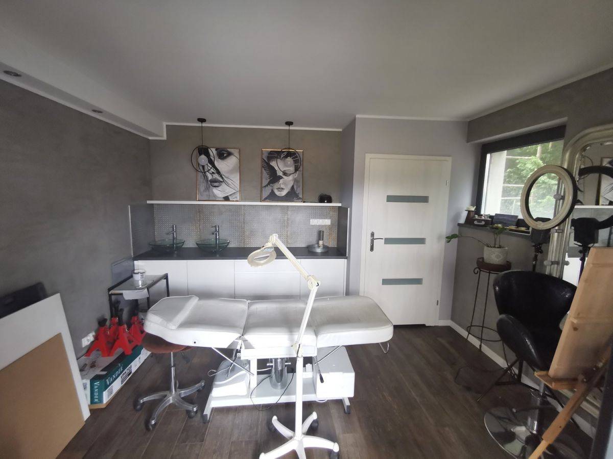 W budynku mieszkalnym znajdują się następujące pomieszczenia: PARTER: wiatrołap (3,57 m²), przedpokój (4,72 m²), salon (26,69 m²), kuchnia (9,80 m²), pokój (10,65 m²), łazienka (5,35 m²), gabinet kosmetyczny z wc (27,76 m²); PODDASZE: 3 pokoje (17,93 m², 12,33 m² i 8,57 m²), łazienka (5,33 m²), przedpokój (3,63 m²), klatka schodowa (4,72 m²) oraz strych (14,82 m²).