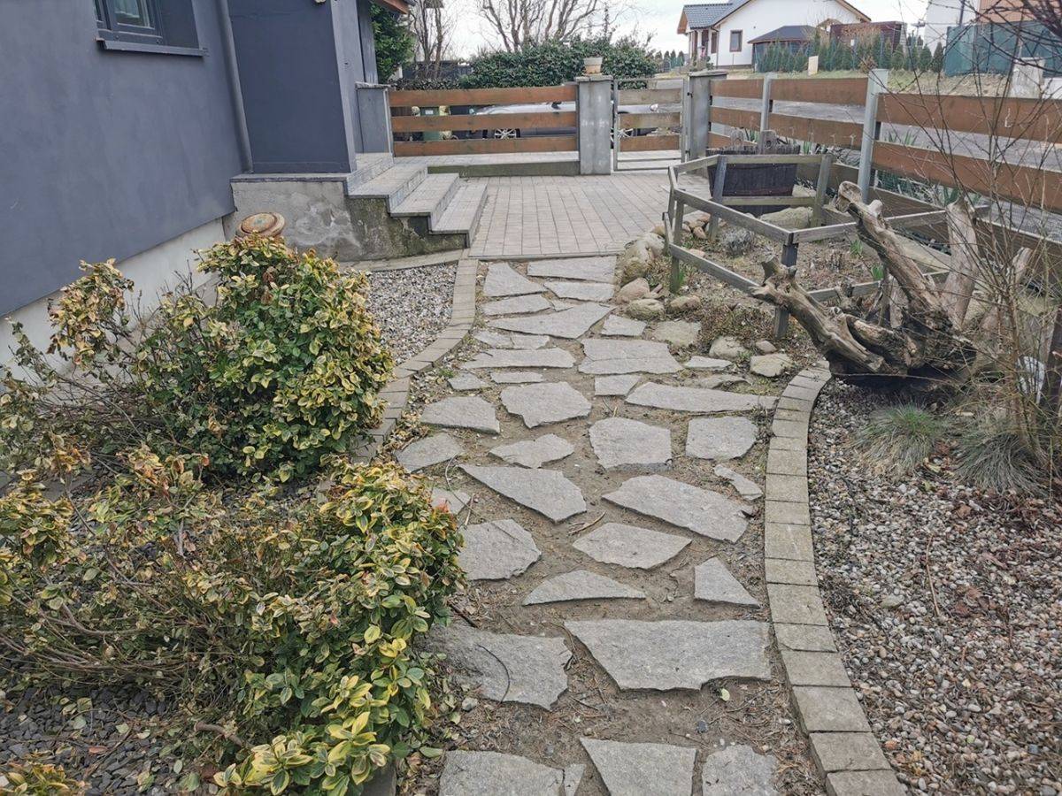 POZA ZABUDOWANĄ CZĘŚCIĄ DZIAŁKI (część północno - zachodnia obejmująca budynek mieszkalny z podjazdem i tarasem oraz część wschodnia z garażem wolnostojącym) POŁUDNIOWA I ŚRODKOWA CZĘŚĆ DZIAŁK STANOWI CZĘŚĆ REKREACYJNĄ O POWIERZCHNI OKOŁO 600 m², POROŚNIĘTĄ TRAWĄ, KRZEWAMI I DRZEWAMI OZDOBNYMI ORAZ DRZEWAMI OWOCOWYMI (wiśnia, śliwa - węgierka, brzoskwinia, jabłoń). NIEODŁĄCZNĄ CZĘŚĆIĄ STREFY REKREACYJNEJ JEST TARAS OD STRONY POŁUDNIOWO - WSCHODNIEJ BUDYNKU Z WIDOKIEM NA TERENY ZIELONE DZIAŁKI.
