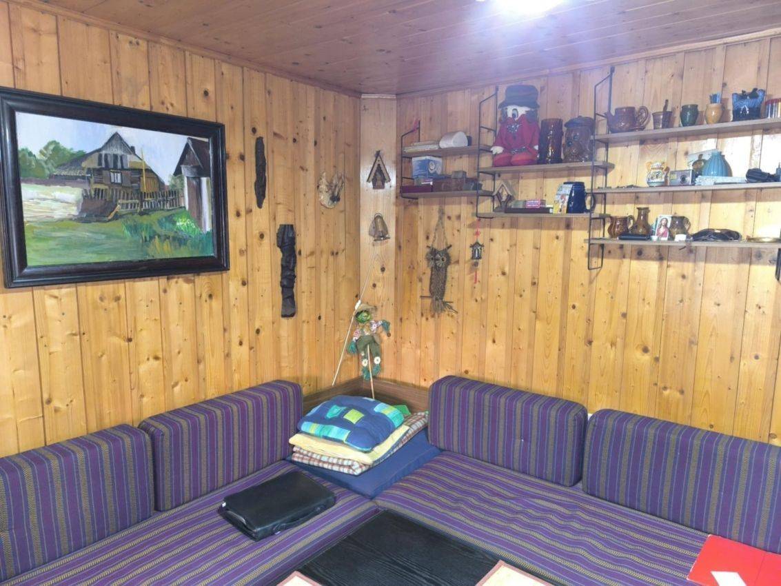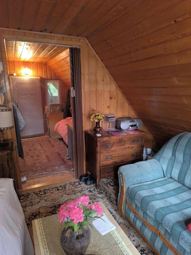 Domek jest w dużej mierze drewniany z przełomu lat 90 tych, z częściowo murowanymi elementami, parterowy z poddaszem użytkowym, na którym znajduje się sypialnia. Na parterze znajduje się pokój dzienny połączony z przechodnią kuchnią. Łazienka wyposażona jest w kabinę prysznicową, a toaleta znajduje się na zewnątrz.