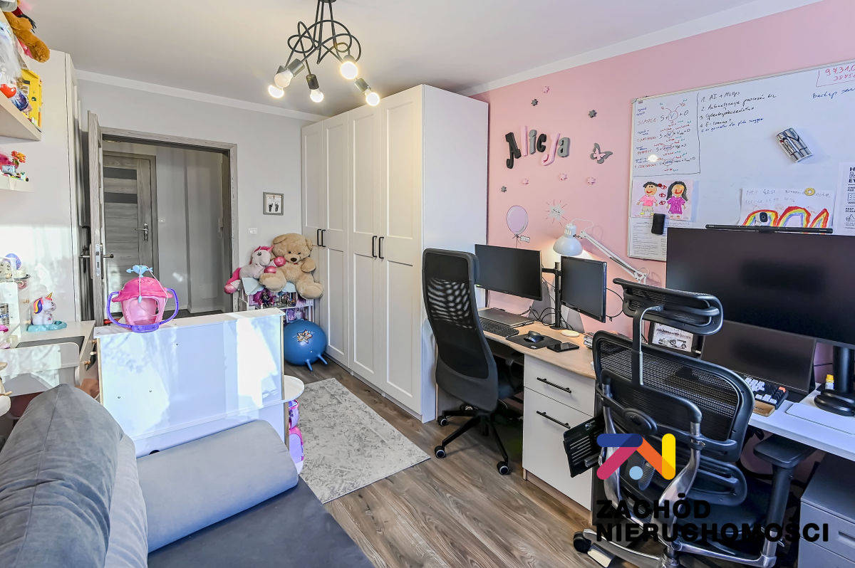 W sypialni i przedpokoju znajdują się duże, wykonane na zamówienie szafy, zapewniające mnóstwo miejsca do przechowywania. Dodatkowo, w dziecięcym pokoju mieszczą się trzy szafy, które pozostają na wyposażeniu, a cały rozkład pomieszczeń został tak przemyślany, by maksymalnie ułatwić codzienne funkcjonowanie.