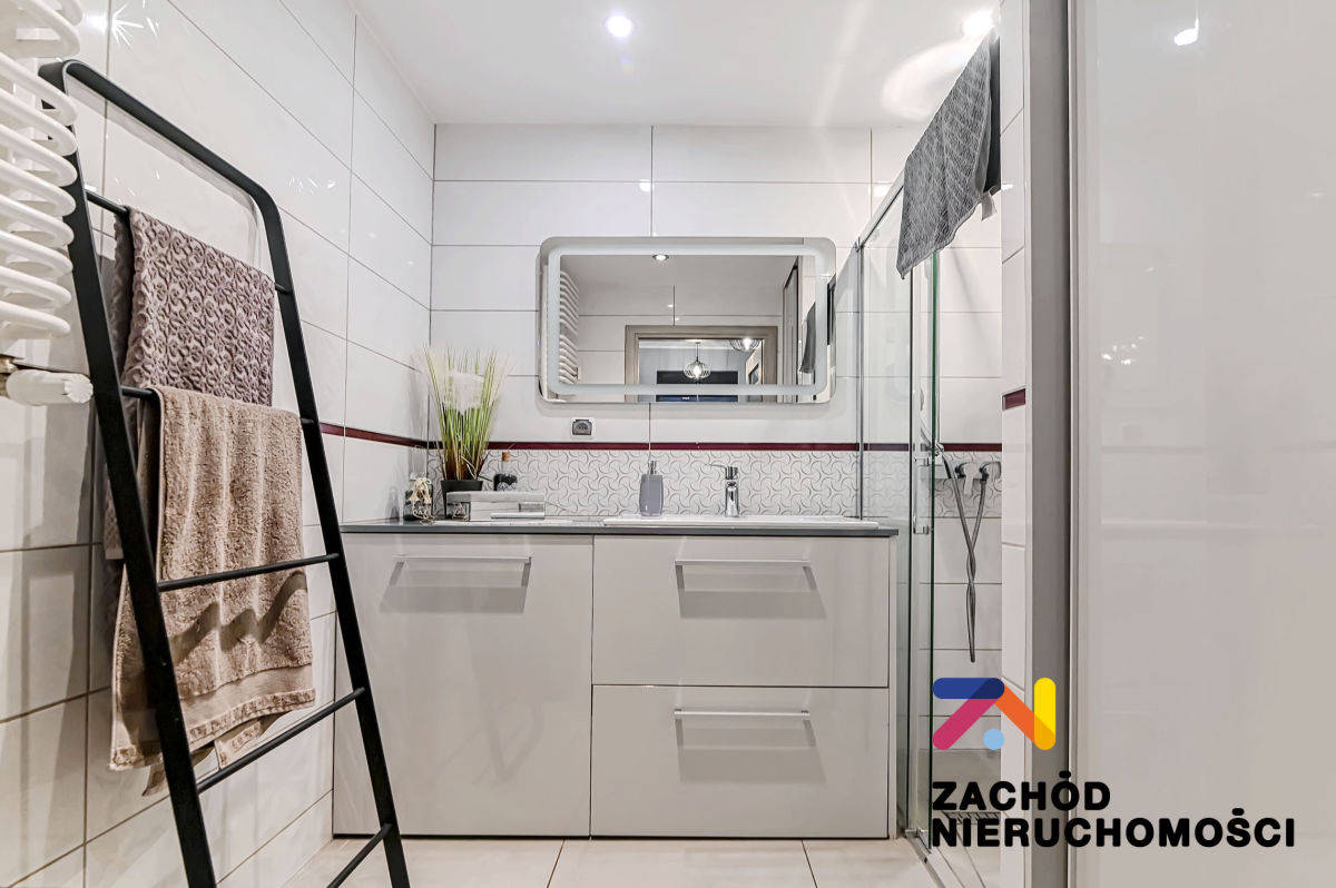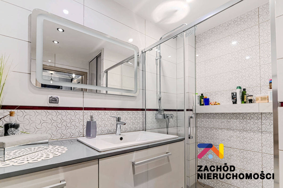 Łazienka wyposażona jest w kabinę prysznicową oraz praktyczną szafę w zabudowie, zapewniając komfort i funkcjonalność.