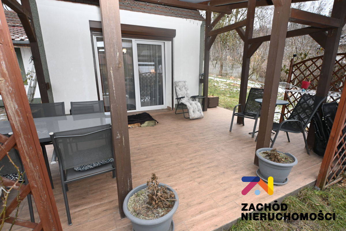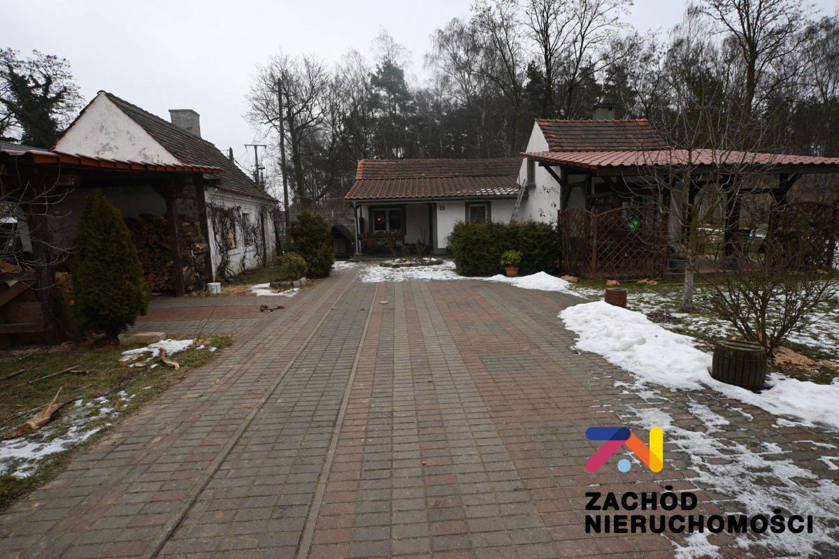 Działka w pełni zagospodarowana, teren ogrodzony z bramą wjazdową oraz z tyłu furtką do lasu. Część posesji pokryta kostką brukową, na pozostałej części trawa oraz liczne nasadzenia.