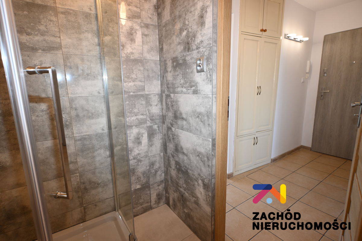 2. Łazienka wyposażona w narożną kabinnę prysznicową, umywalkę, szafkę pod umywalką, pralkę.