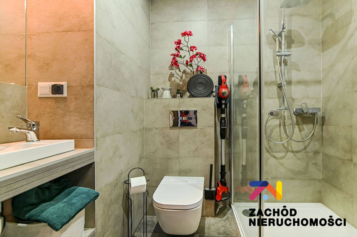 - Łazienka dolna - nowoczesna, z kabiną prysznicową i toaletą.