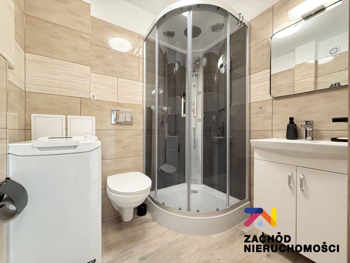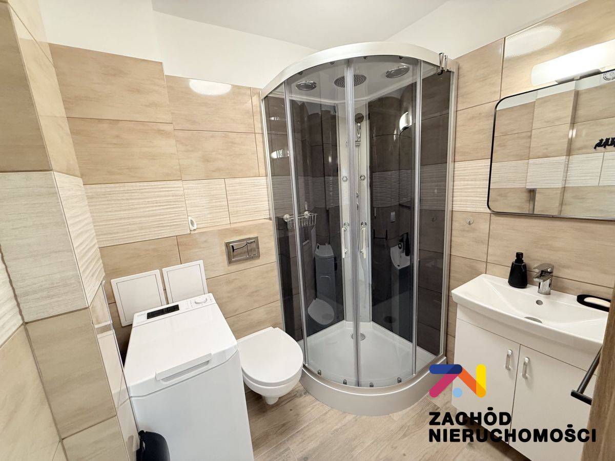 Kabina prysznicowa, zlew z szafką, toaleta, pralka.
