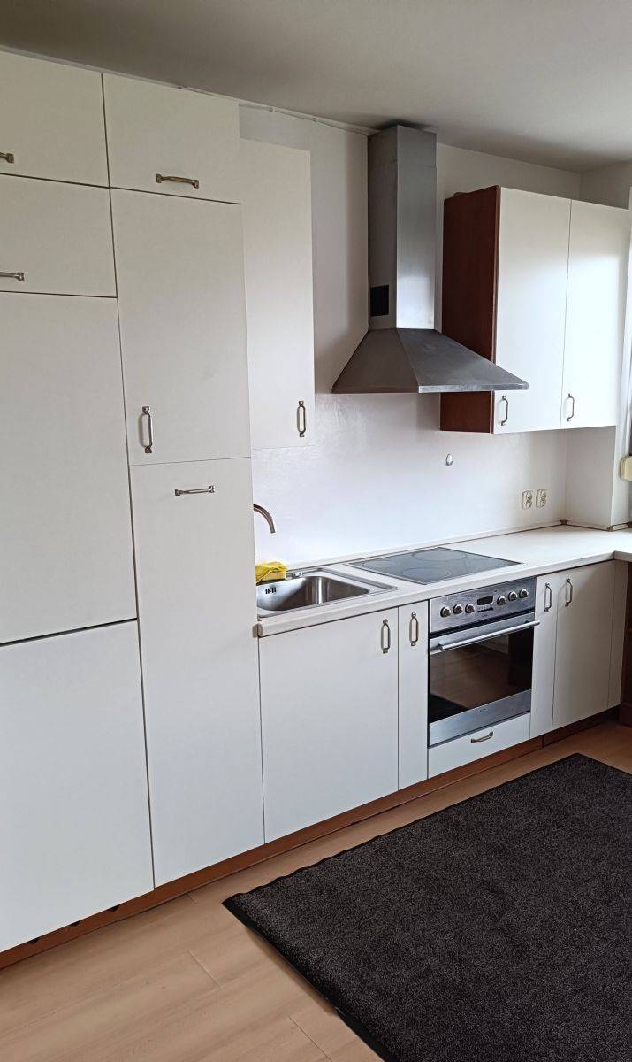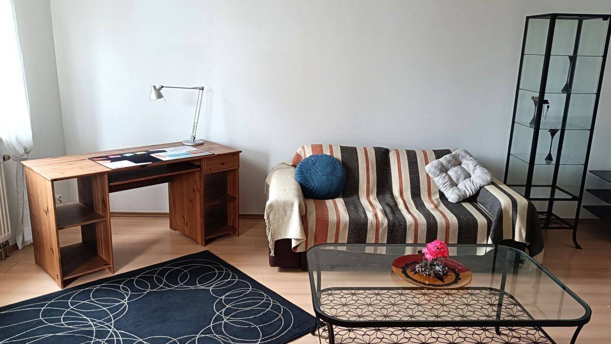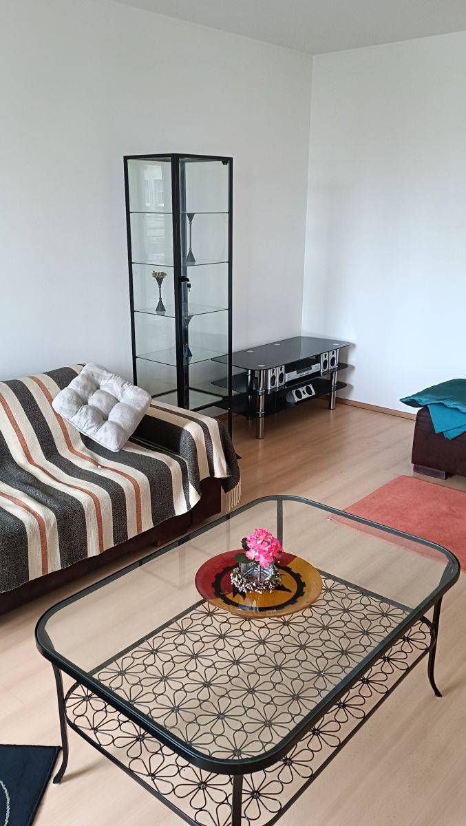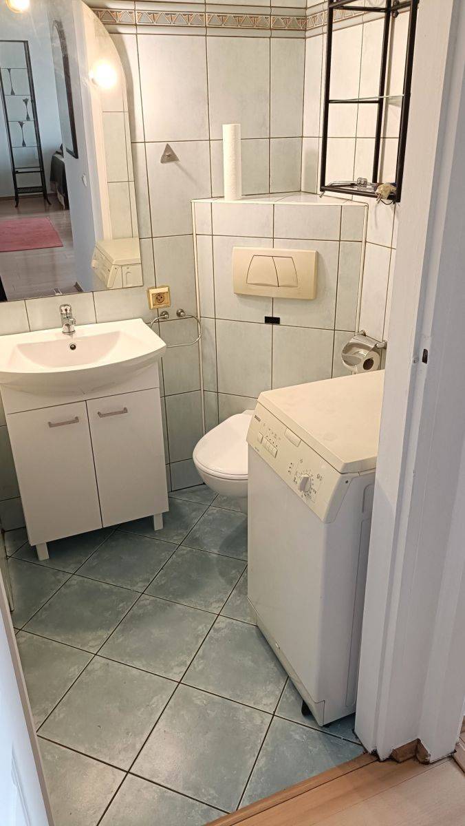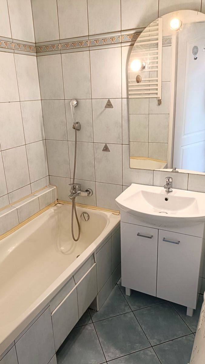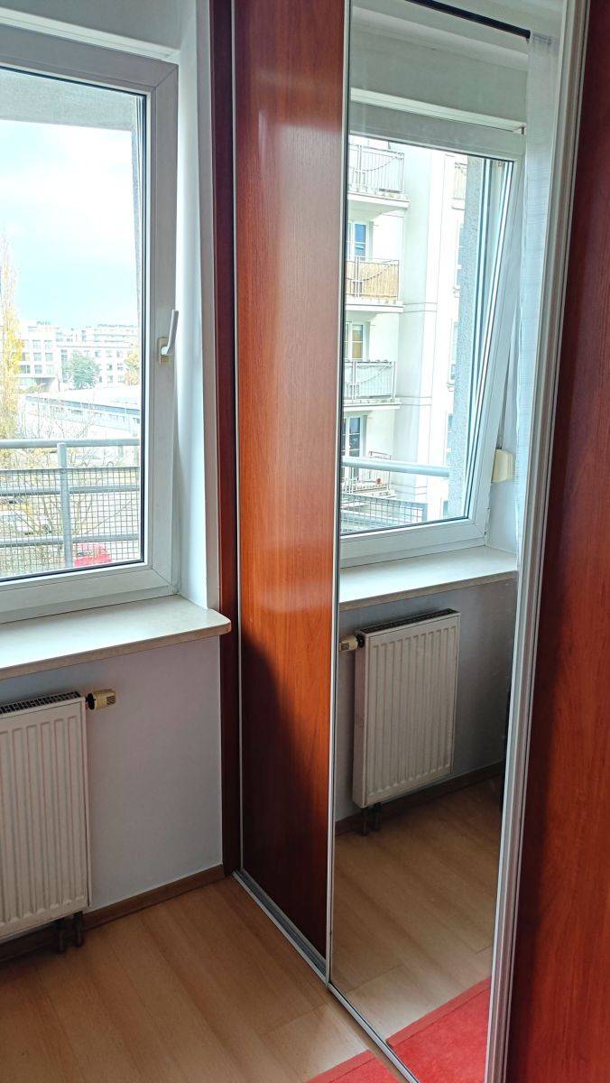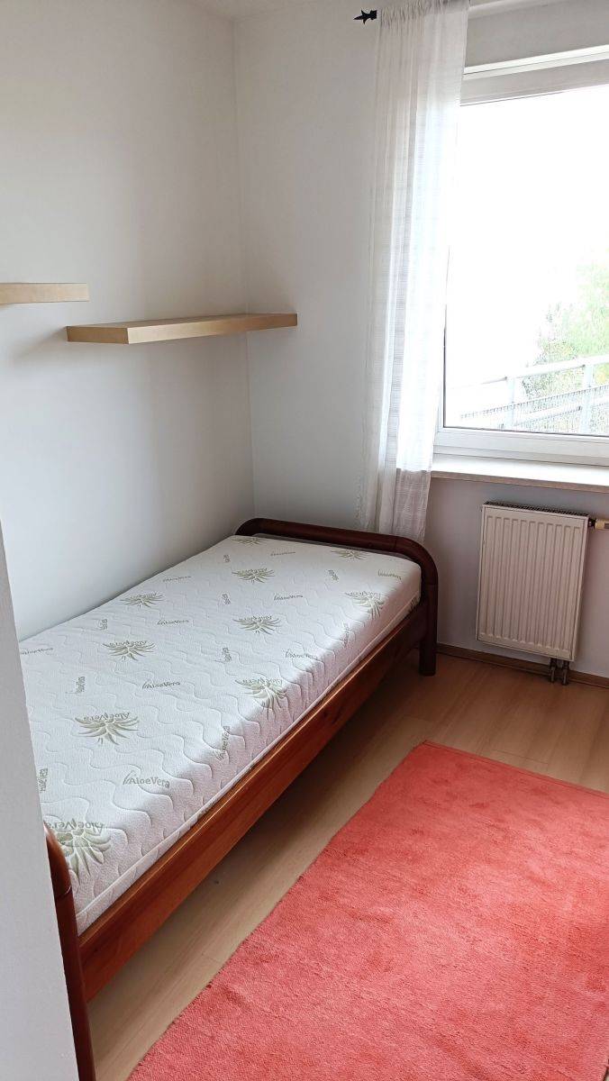 Sypialnia została wyposażona w wygodne łóżko oraz pojemną, zabudowaną szafę, zapewniającą dużo miejsca na przechowywanie. Podłogi w mieszkaniu wykończone są panelami, łazienka w płytkach.. Do dyspozycji najemców jest również pralka.