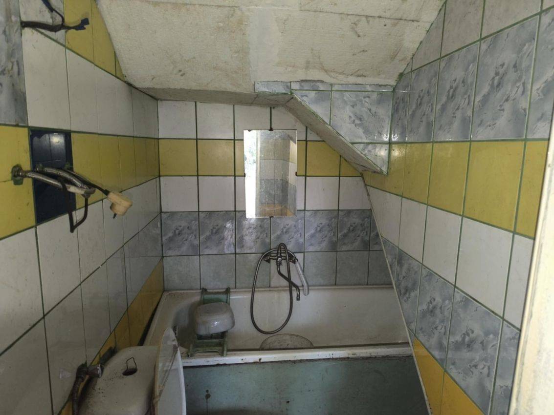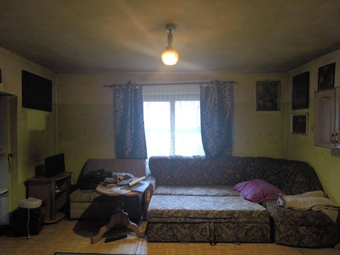 Na parterze znajdują się dwa przechodnie pomieszczenia: kuchnia i pokój, a także niewielka łazienka. Klatka schodowa prowadzi na poddasze, które po remoncie może zyskać dodatkową przestrzeń użytkową.