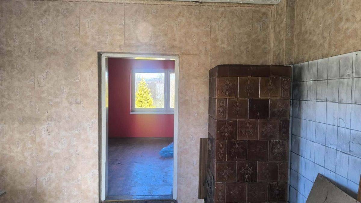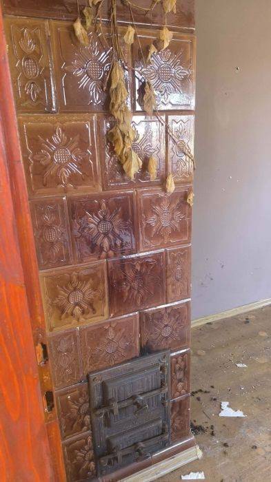 - Parter: ganek/wiatrołap, korytarz z łazienką (do remontu), kuchnia z piecem kuchennym, przechodni pokój z piecem kaflowym oraz dwa pokoje po lewej stronie.