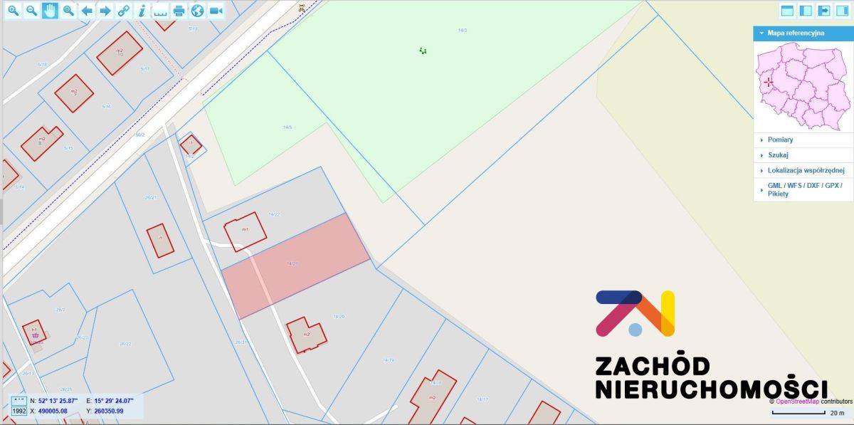 Teren płaski w kształcie do prostokąta, front szerokość ok 20m, długość ok 65m. Po obu stronach oferowanej działki nowo wybudowane wolnostojące domy jednorodzinne wyznaczające linię zabudowy.