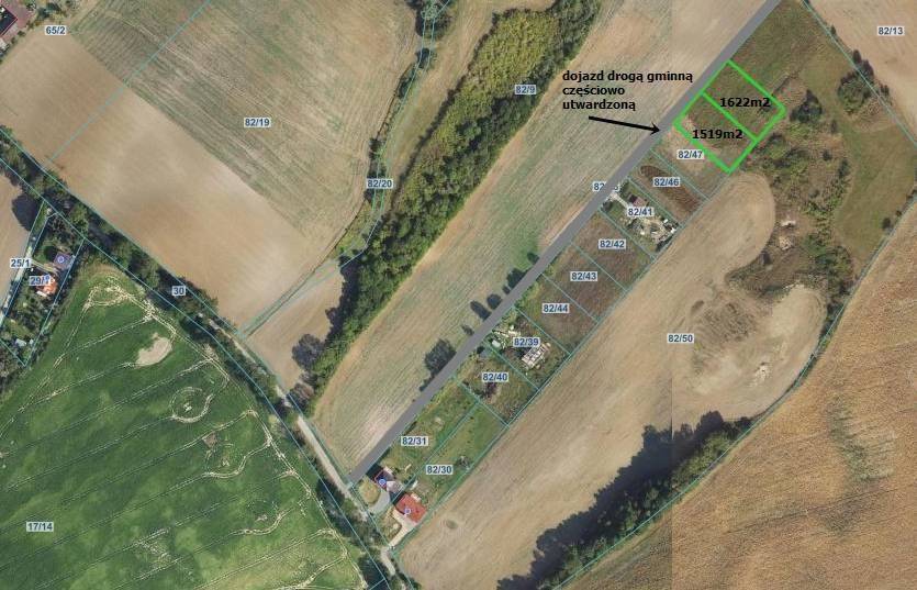 - dojazd do działek: drogą brukową (2 km od mostku) i ok 375m gminną drogą częściowo utwardzoną tłuczniem szerokości 6m,