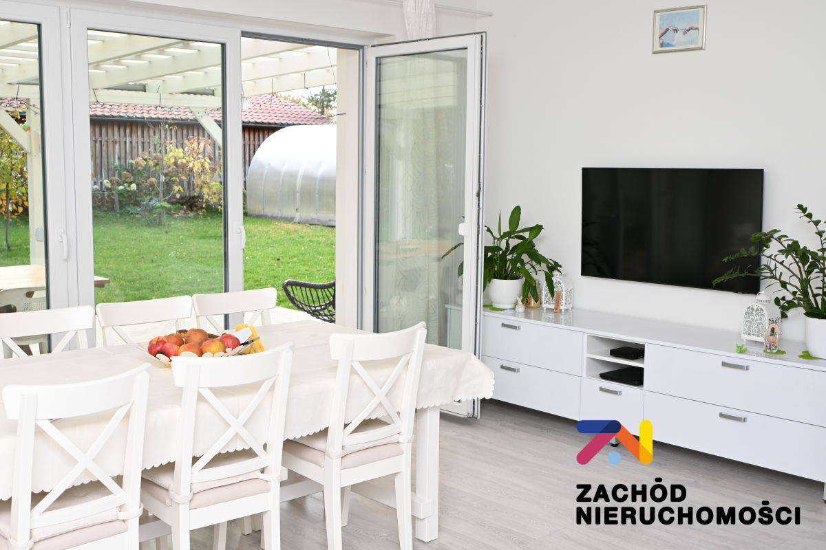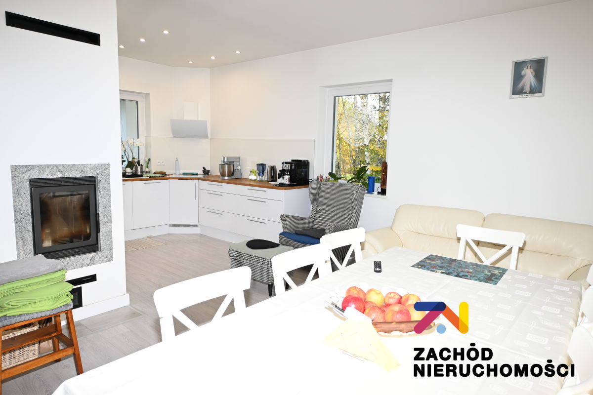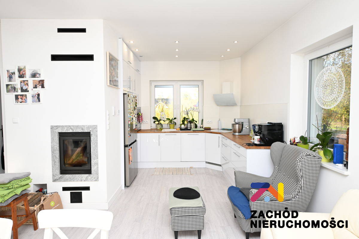 - Salonz aneksem kuchennym łącznie 29,53m2 . Niesamowitym atutem tej przestrzeni wypoczynkowej jestduże cztero-taflowe przeszklenie na część ogrodową i zadaszony taras oraz zabudowany kominek, Kuchnia posiada pełną zabudowę w kolorze białym, w tym płyta indukcyjna, lodówka, zlew i zmywarka. Blat w kolorze ciepłego drewna.