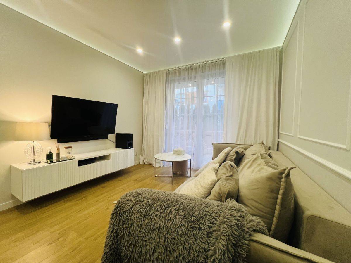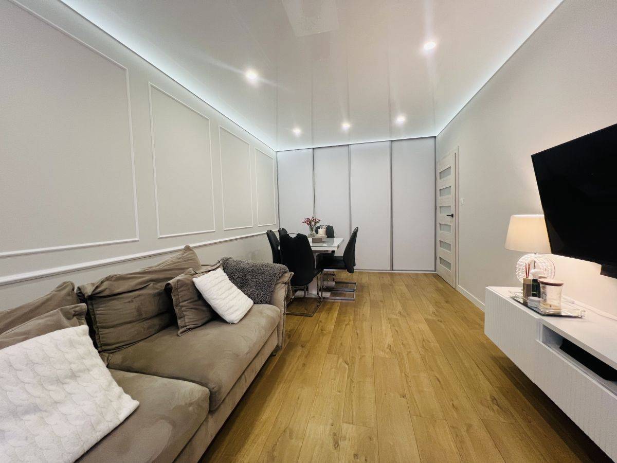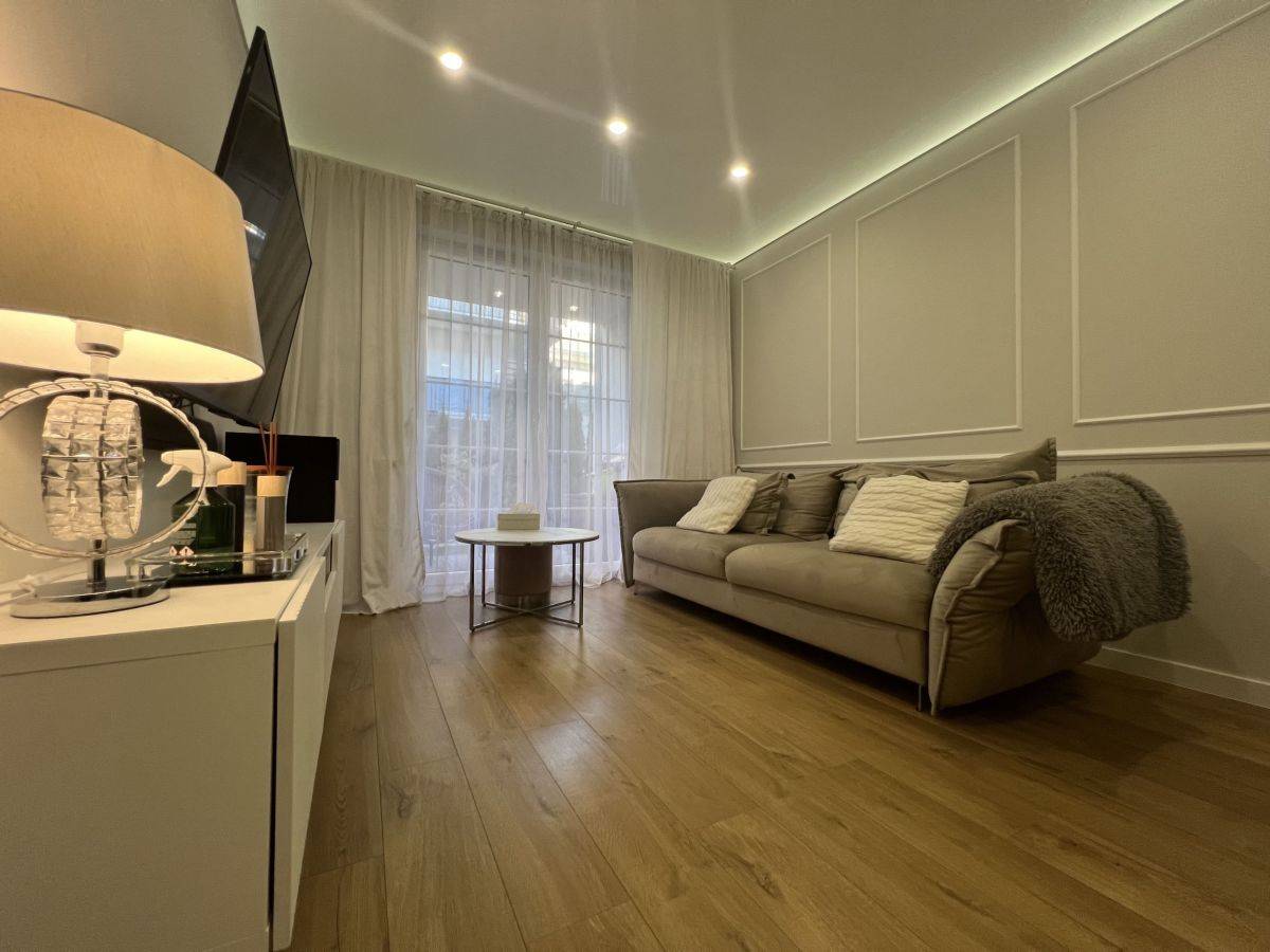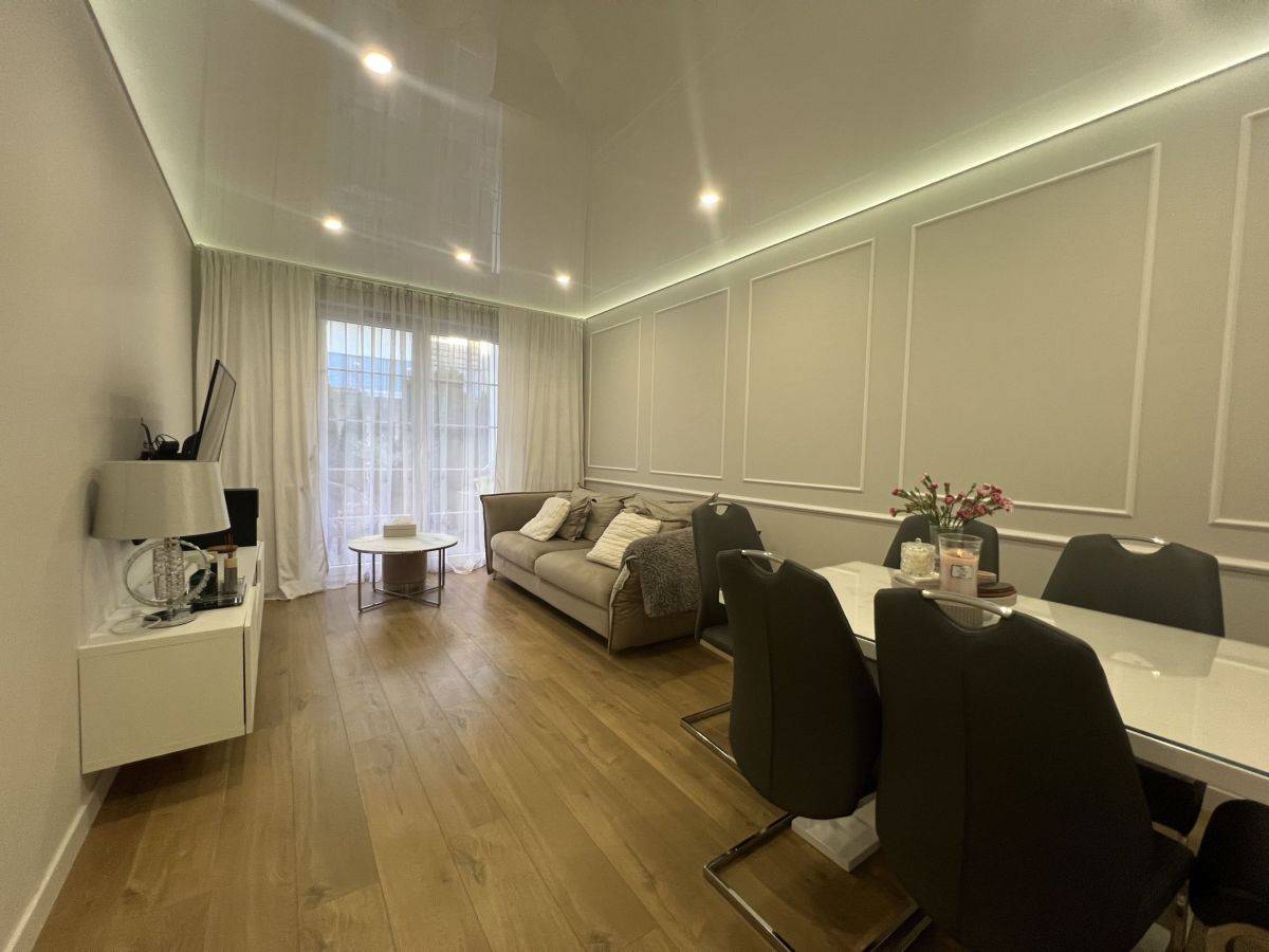 - elegancki salon ze stylową sztukaterią oraz napinanym sufitem z oświetleniem LED