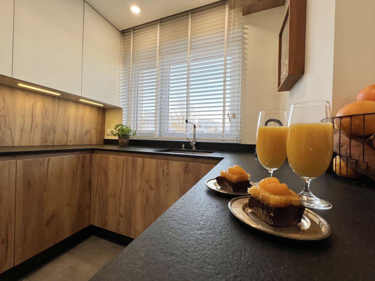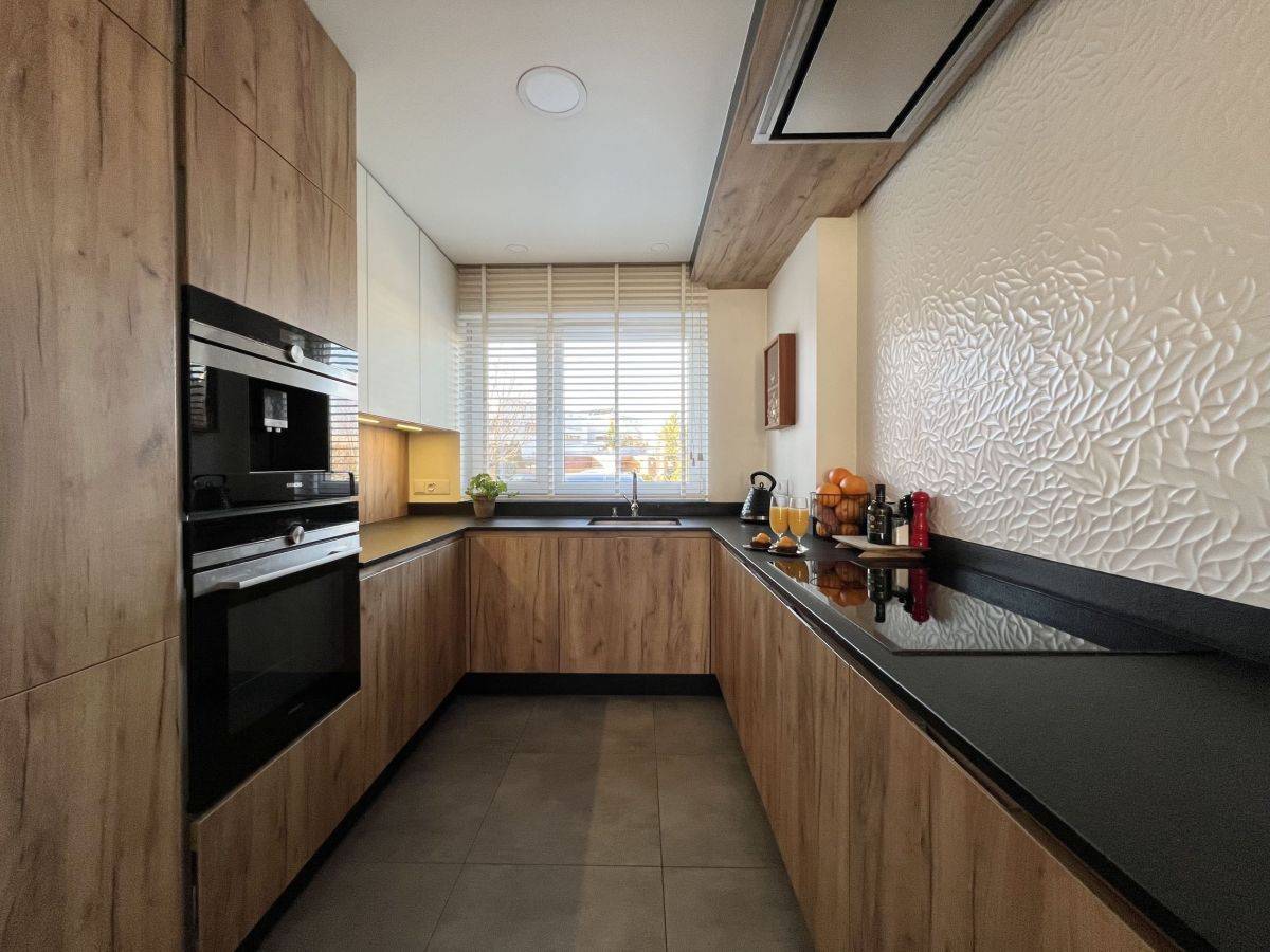 - kuchnia (8,36 m2): meble z 2019r. zamówione na wymiar (ATLAS Kuchnie) wraz ze wszystkimi niezbędnymi sprzętami: płyta indukcyjna 80 cm Siemens, piekarnik Siemens, zmywarka (45 cm) Electrolux, lodówka-zamrażalnik Bosch, ekspres w zabudowie Siemens, wydajny okap sufitowy Elta (sterowany pilotem), blat kamienny (granit indyjski płomieniowany), zlewozmywak stalowy podwieszany