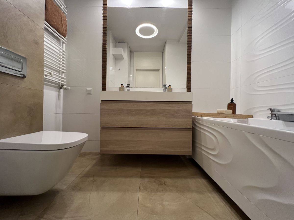 - łazienka (5,42 m2) z wanną, z zabudową pralki i pieca gazowego dwufunkcyjnego;