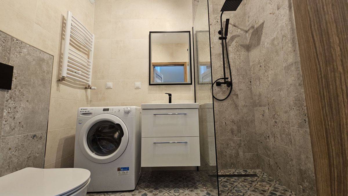 Mieszkanie jasne, słoneczne. Okna PCV, z wystawą południowo-zachodnią . W oknach żaluzje zewnętrzne chroniące przed nadmiernym nasłonecznieniem. Kuchnia w nowoczesnej zabudowie z wysokiej klasy sprzętem AGD (płyta grzewcza elektryczna, zmywarka, okap, lodówko-zamrażarka, zlew). W sypialni 2 osobowe łóżko, szafki nocne, duża, pojemna szafa garderobiana. W salonie: rozkładana sofa, stolik kawowy, szafka pod telewizor, TV, wiszące regały, komoda, stół jadalniany i 3 krzesła. Łazienka z kabiną prysznicową, pralką, umywalką, szafką oraz WC. Duży słoneczny balkon 5,5m2 z widokiem na spokojny dziedziniec budynku.