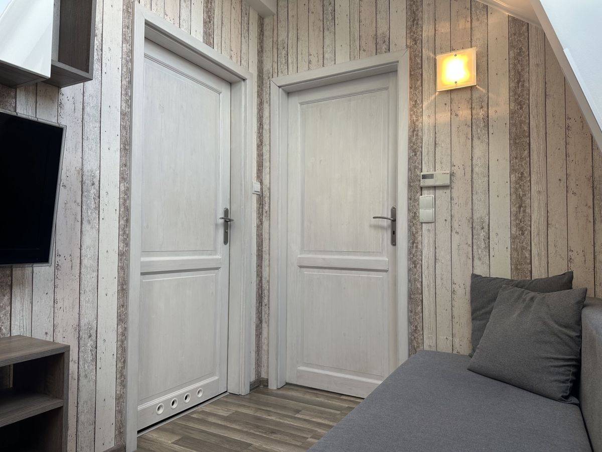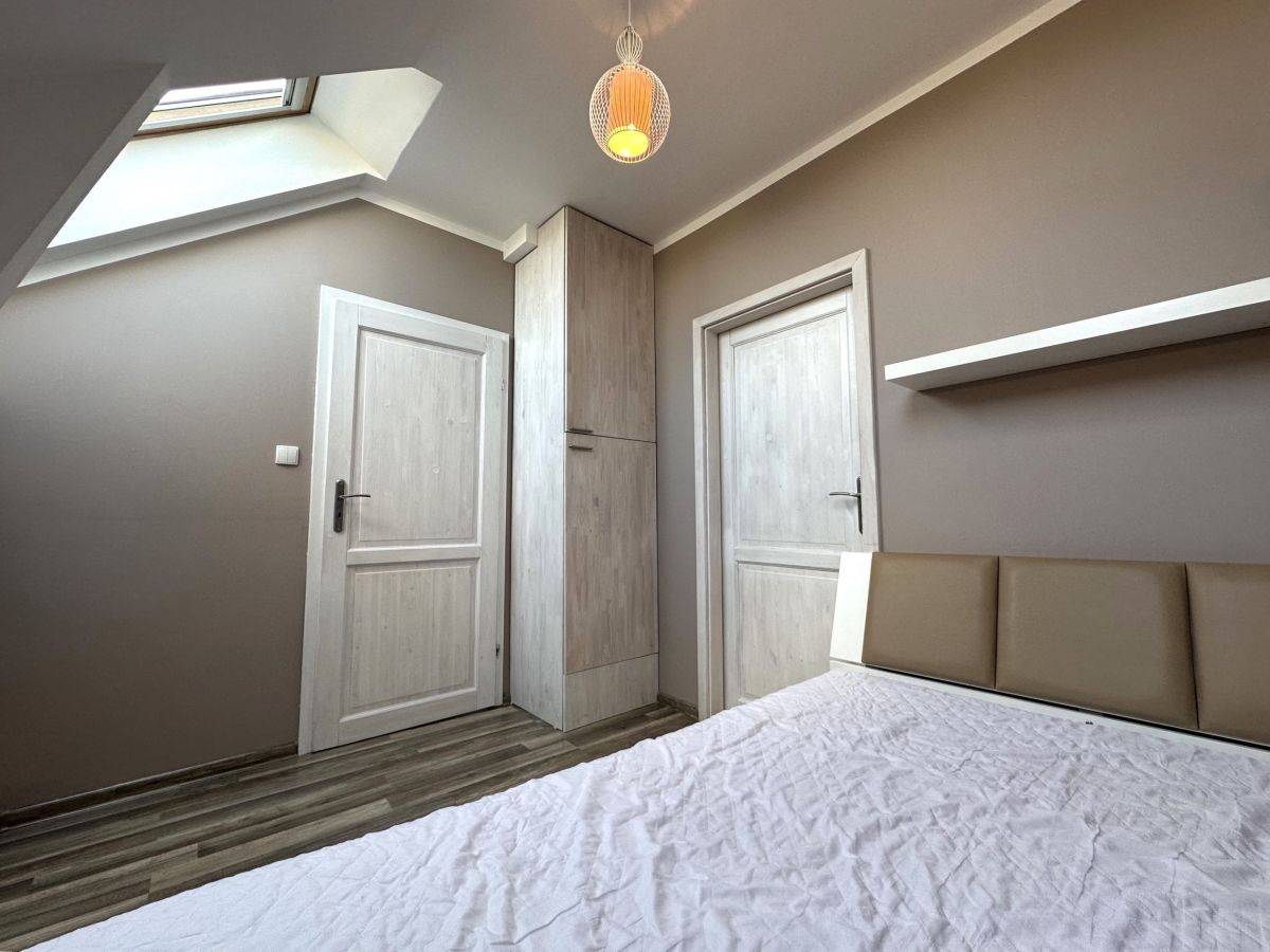 Panele podłogowe w salonie, sypialni i garderobie, płytki ceramiczne w kuchni, korytarzu, łazience. Drzwi drewniane. Okna połaciowe drewniane.
