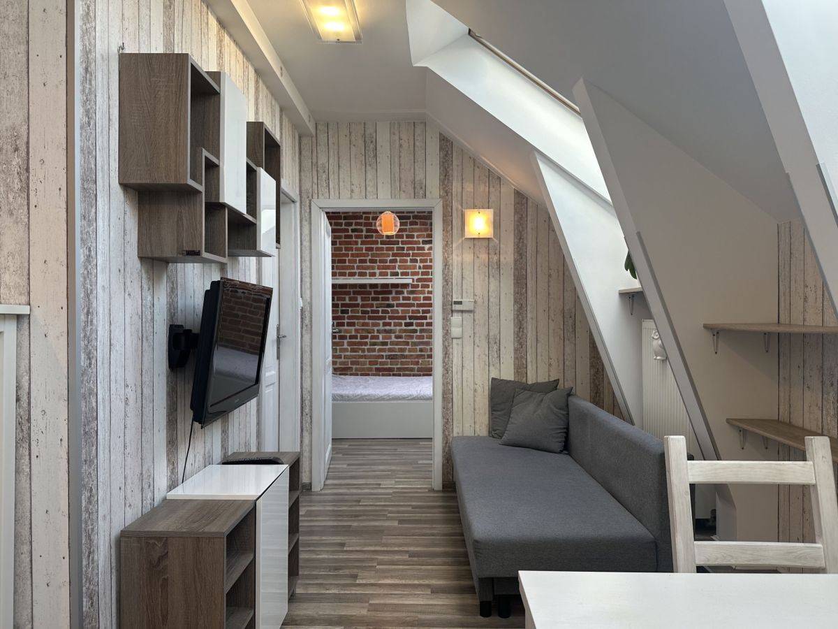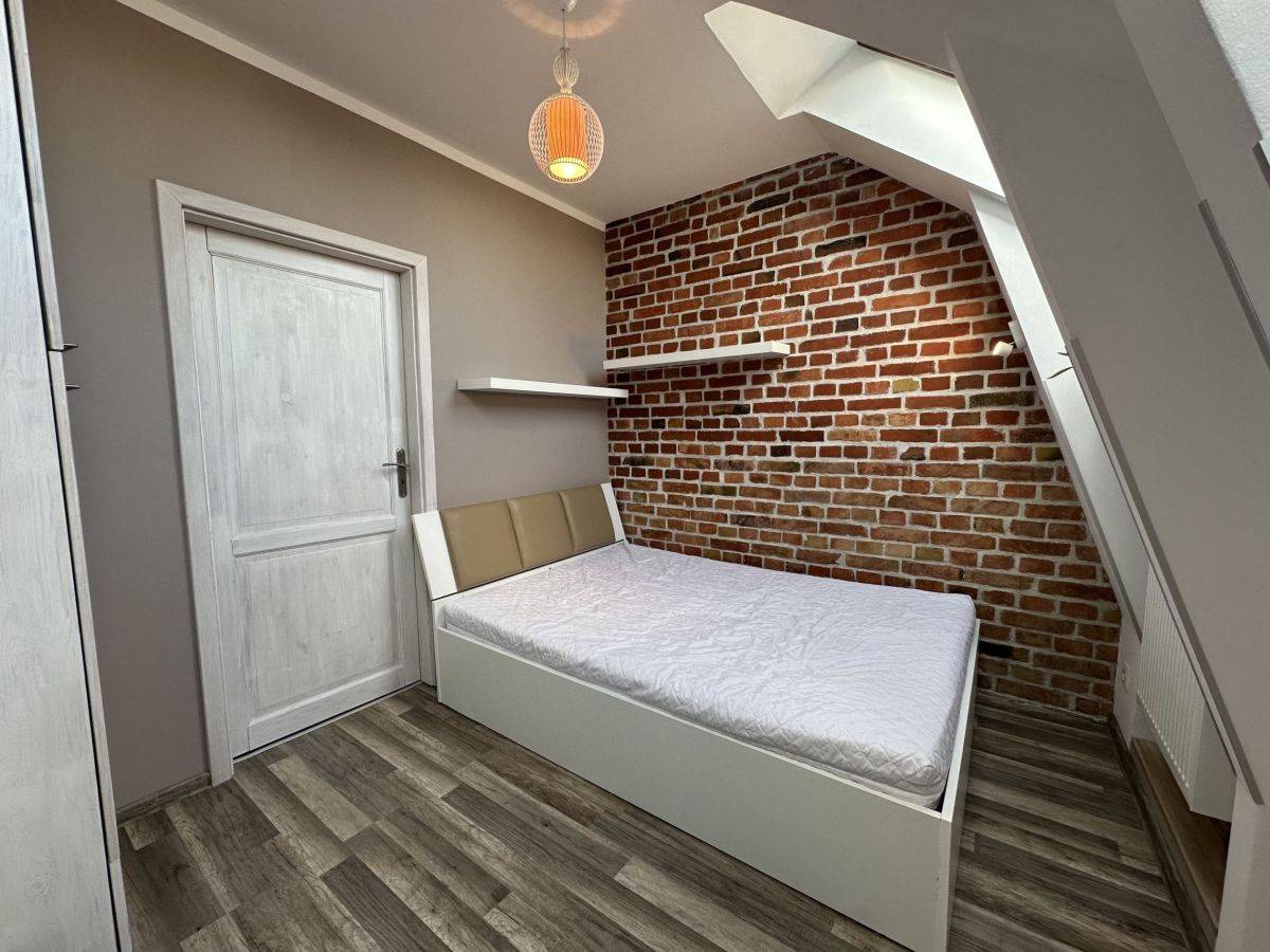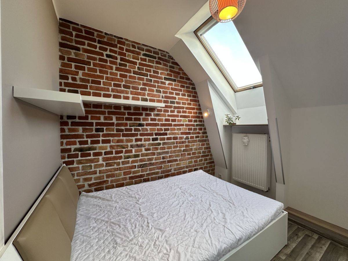 Mieszkanie wykończone w nowoczesnym, harmonijnym stylu z zachowaniem elementów stylizacji obecnych w kamienicach (cegła) składa się z korytarza, jasnego salonu z aneksem kuchennym, sypialni z oddzielną garderobą oraz łazienki. Mieszkanie ze skosami. Bardzo jasne i słoneczne.