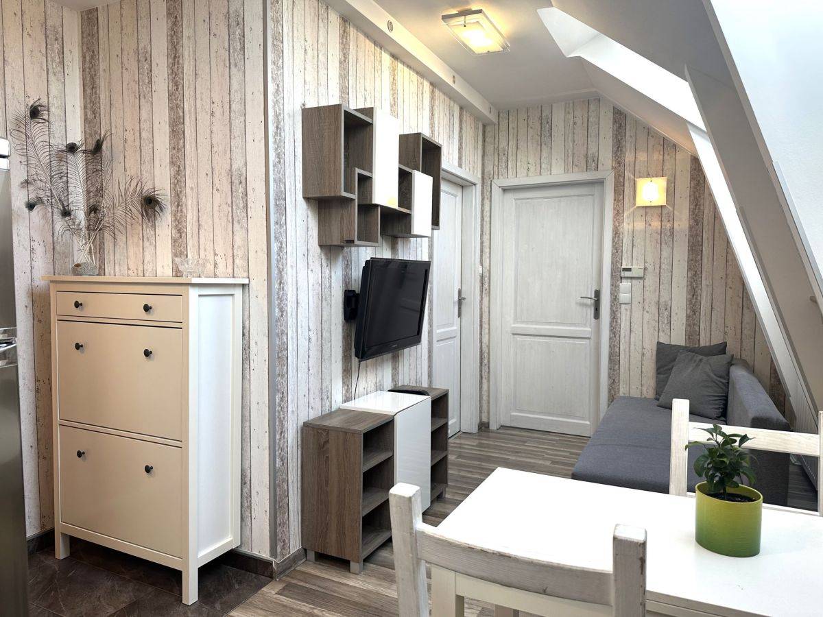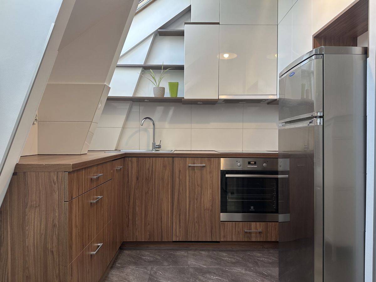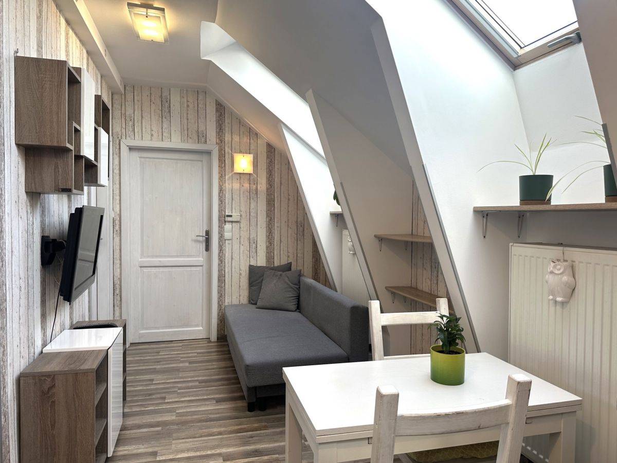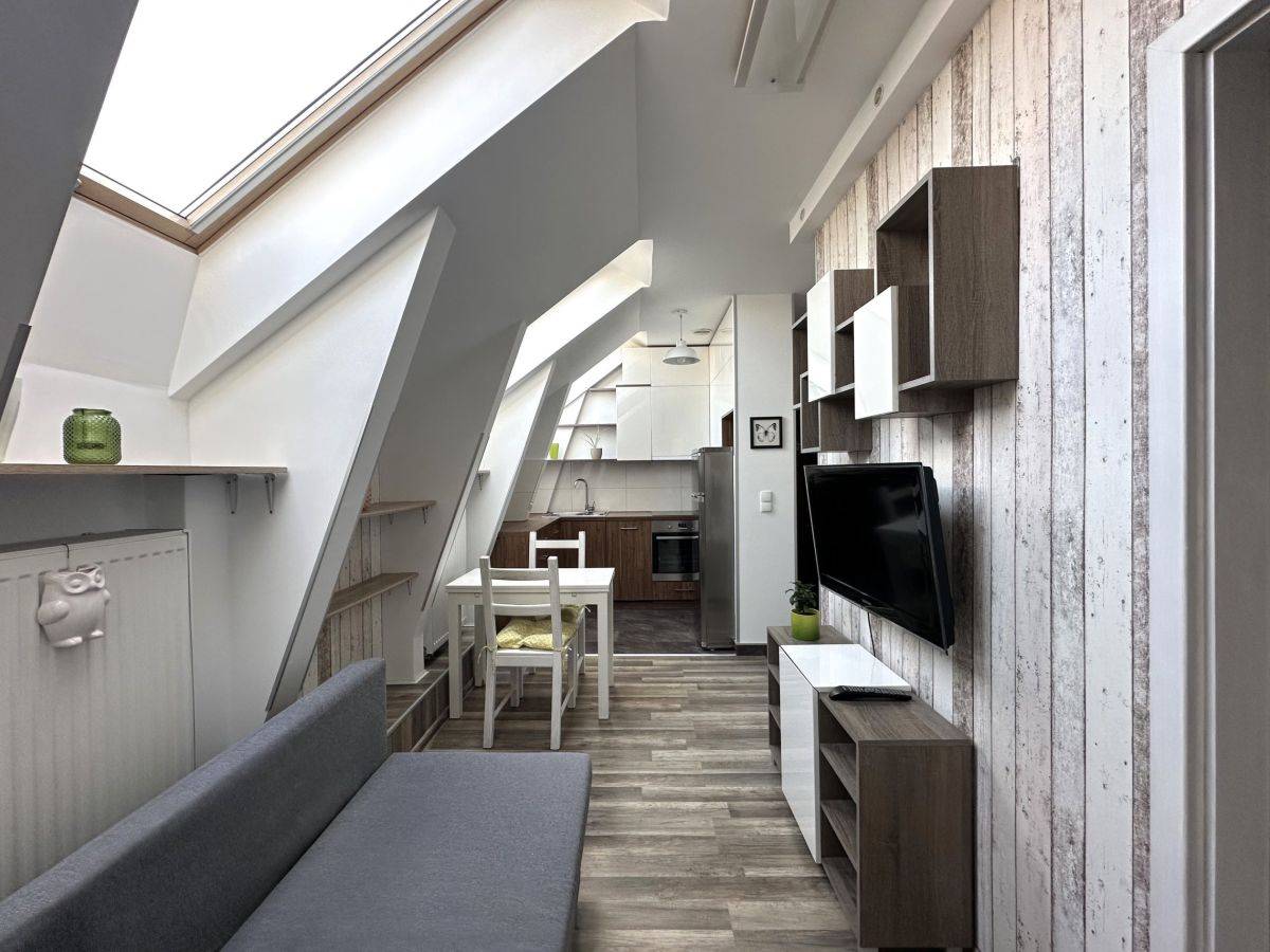 Mieszkanie wykończone w nowoczesnym, harmonijnym stylu z zachowaniem elementów stylizacji obecnych w kamienicach (cegła) składa się z korytarza, jasnego salonu z aneksem kuchennym, sypialni z oddzielną garderobą oraz łazienki. Mieszkanie ze skosami. Bardzo jasne i słoneczne.