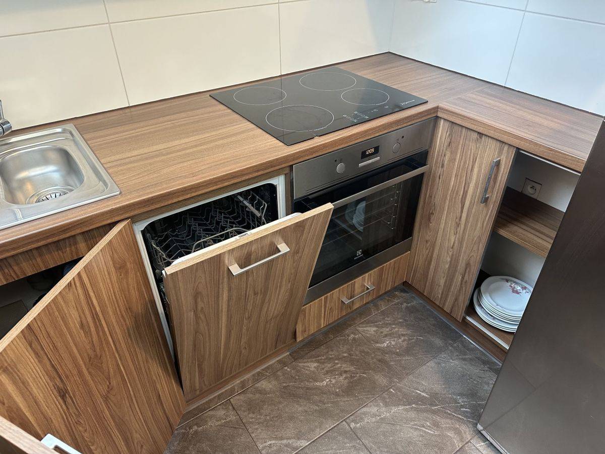 Kuchnia wyposażona w zmywarkę, lodówkę z zamrażarką, płytę i piekarnik wraz z funkcjonalną zabudową stolarską wykorzystującą każdy zakamarek przestrzeni.