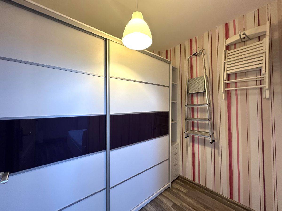 Na wyposażeniu łóżko w sypialni 140 x 200cm, szafa,rozkładana sofa w salonie ze stolikiem RTV i telewizorem, stół i 2 krzesła w jadalni, szafka na buty w korytarzu, szafa w zabudowie i regał w garderobie, pralka w łazience.