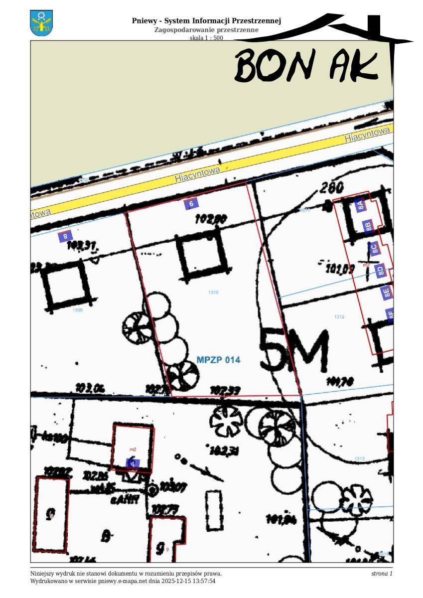 Przedstawiamy na sprzedaż działkę o powierzchni 1584 m², usytuowaną w malowniczych Pniewach, na osiedlu Kwiatowym, przy ul. Hiacyntowej 9. Ta idealnie kształtowana, prostokątna działka znajduje się naprzeciwko lasu, co zapewnia ciszę i bliskość natury.