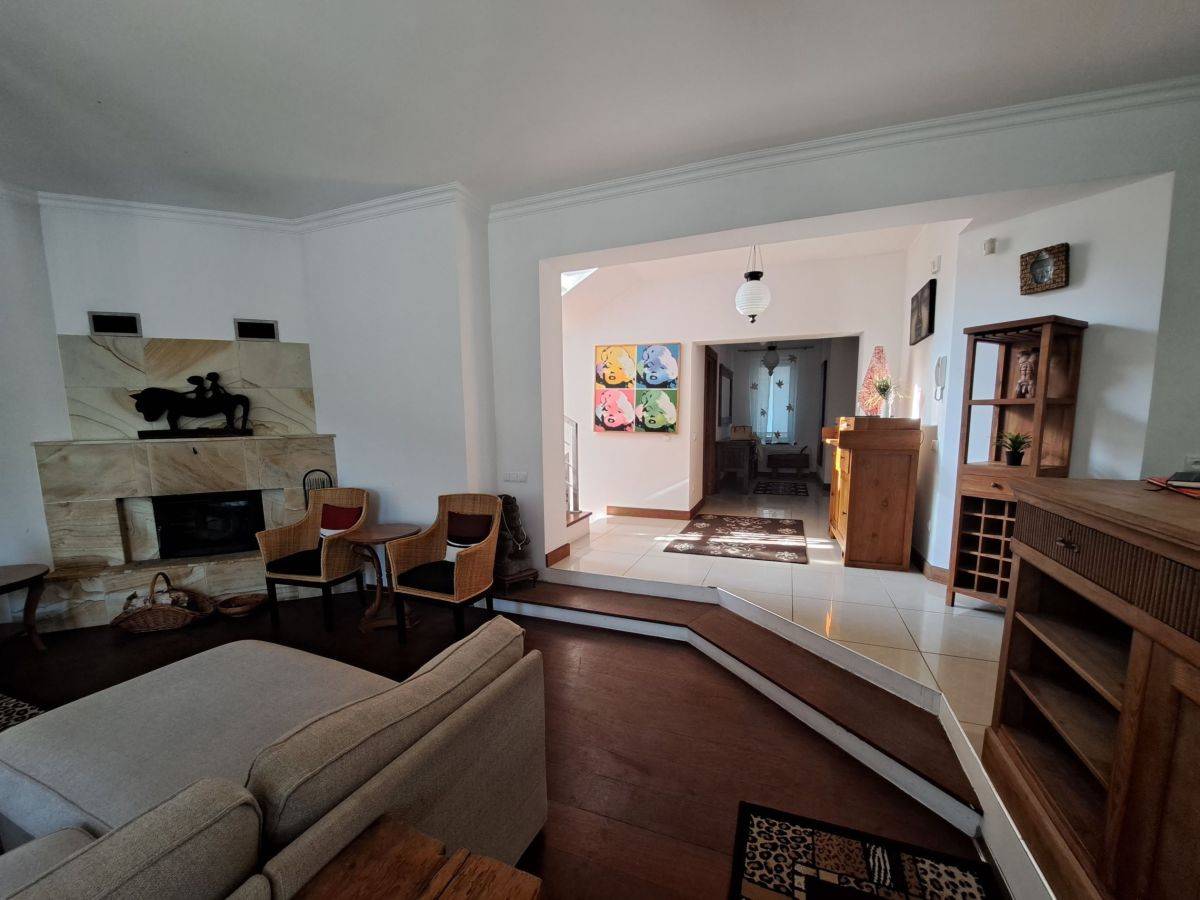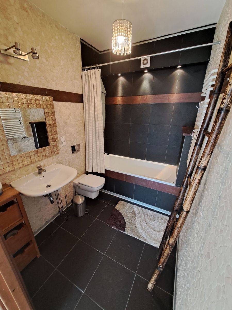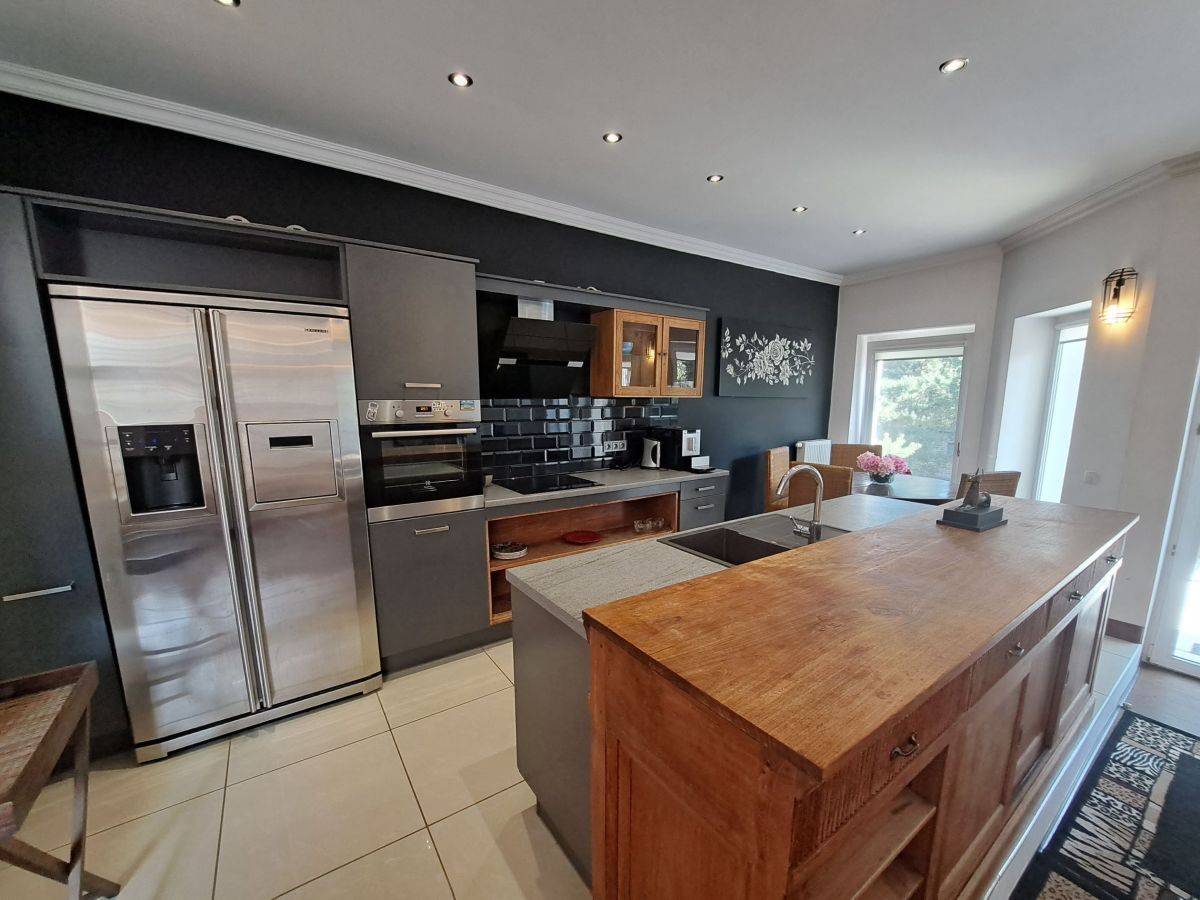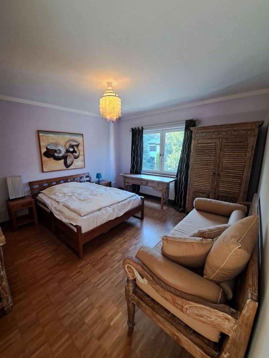 Dom wykończony w bardzo ciekawym stylu, umeblowany, na podłodze drewno egzotyczne Merbau, parkiet dębowy oraz płytki.