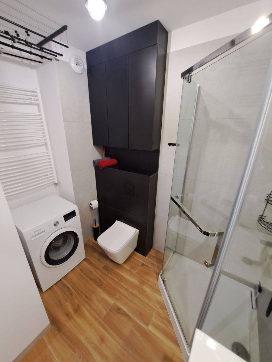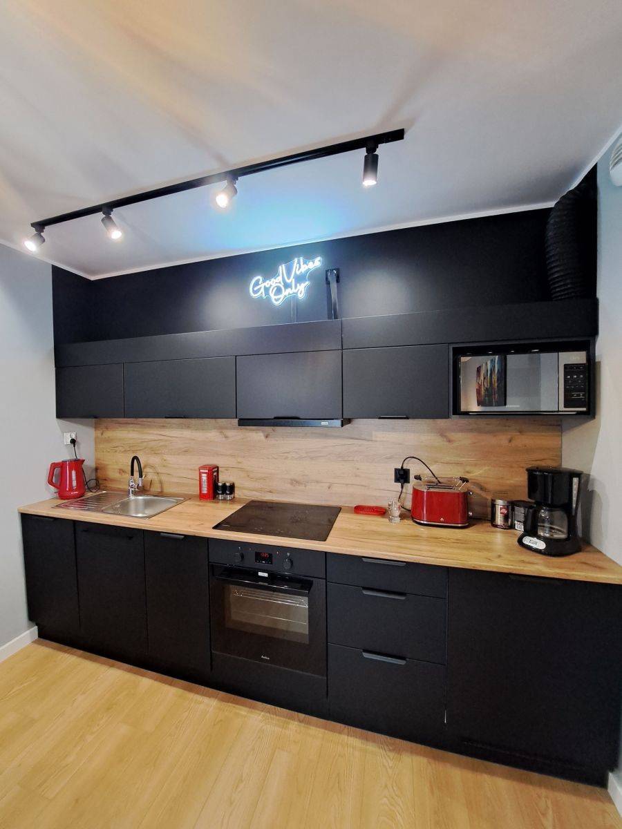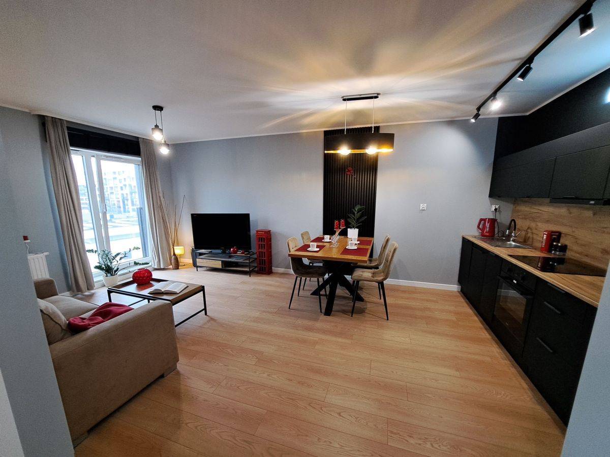 - Kuchnia z wysokiej klasy sprzętem: płyta indukcyjna, piekarnik, chłodziarko-zamrażarka, okap kuchenny oraz zmywarka