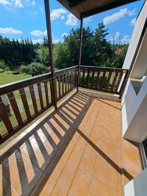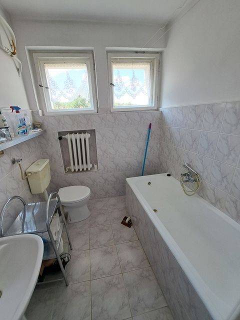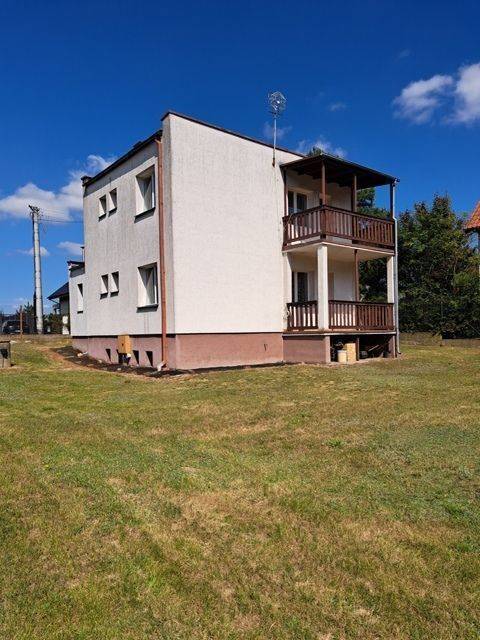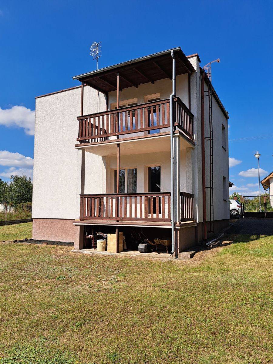 Dom o pow. ok. 100m2, 2 kondygnacje naziemne plus częściowe podpiwniczenie. Na każdej kondygnacji znajdują się: kuchnia, pokój dzienny, hall oraz łazienka. Dom wybudowany z podwójnego muru: pustak plus cegła, ocieplony. Dach płaski. W części piwnicznej znajduje się kotłownia i pralnia. Dom po częściowych remontach - wymieniono oblachowanie i papę, nowe parapety. Okna drewniane, wymienione ok. 10 lat temu. Na podłogach deski sosnowe.
