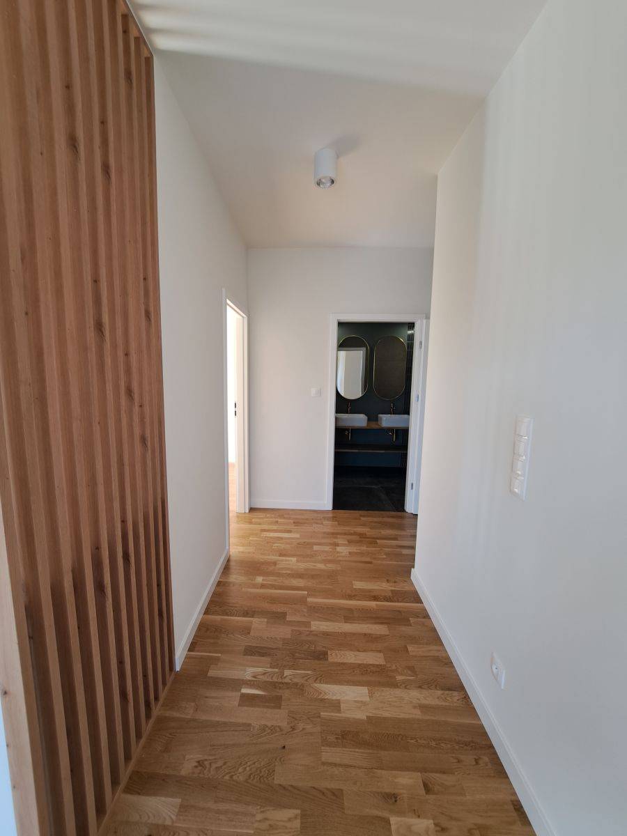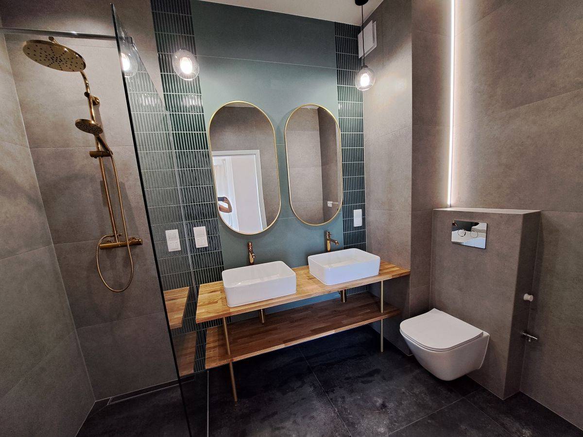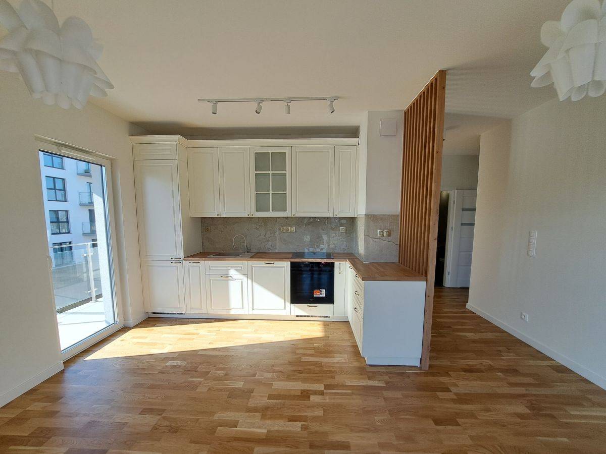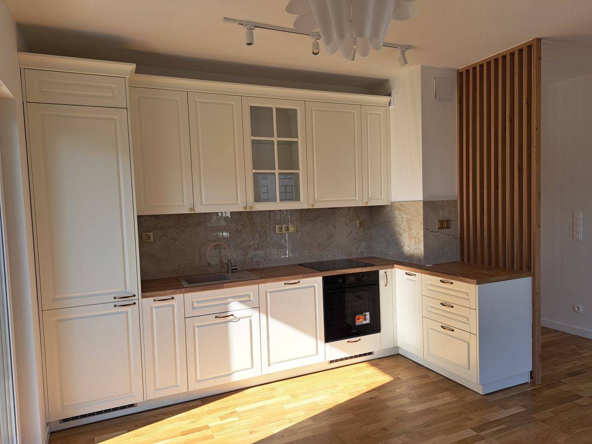 Nowa zabudowa kuchenna, w pełni wyposażona (zmywarka, piekarnik, lodówka, płyta indukcyjna), łazienka wg aranżacji projektanta, na podłodze DESKA BARLINECKA.