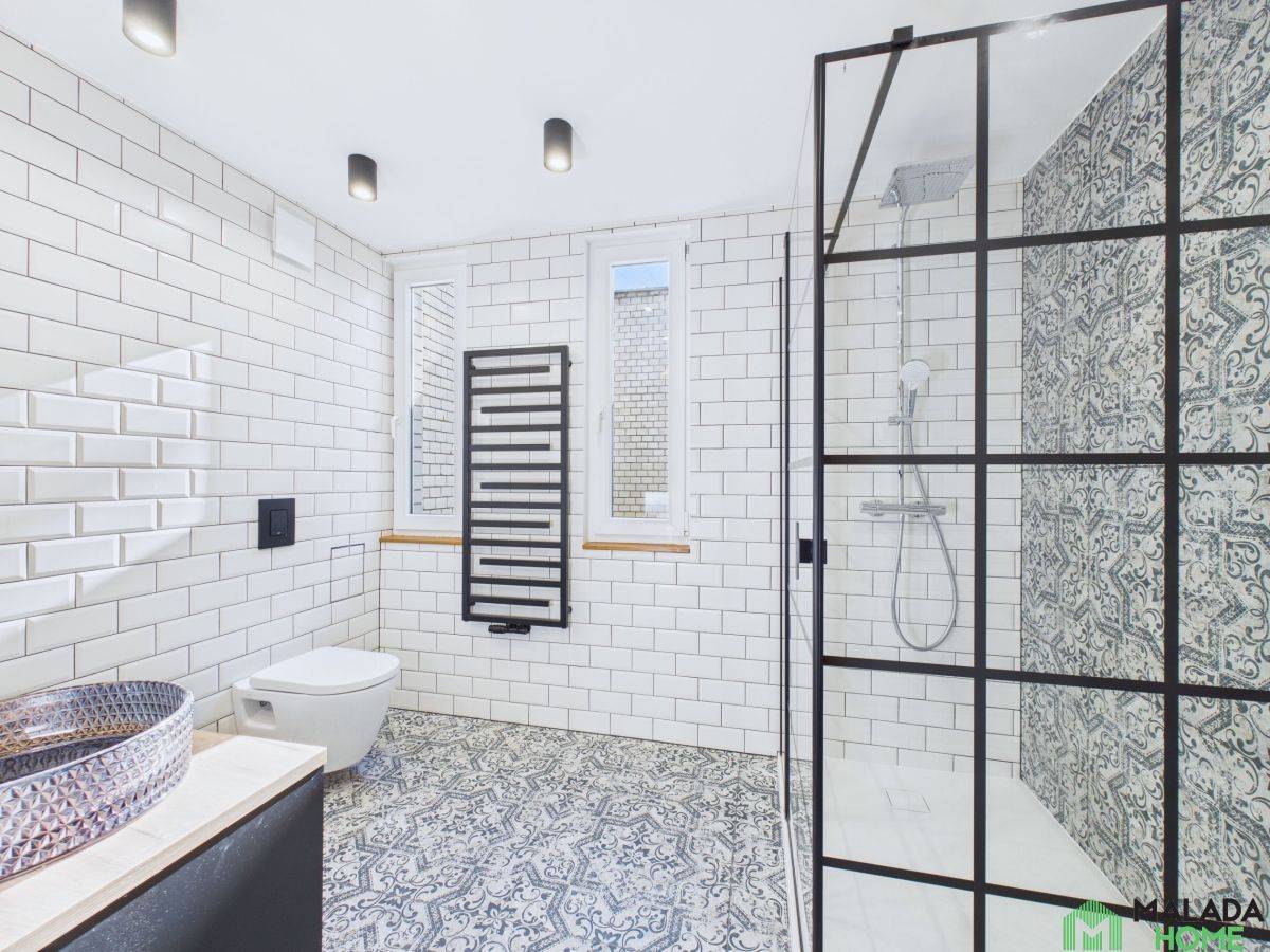 - Elegancka łazienka z oknem , dwiema umywalkami i przestronną kabiną prysznicową, zaprojektowana z myślą o wygodzie i komforcie na co dzień