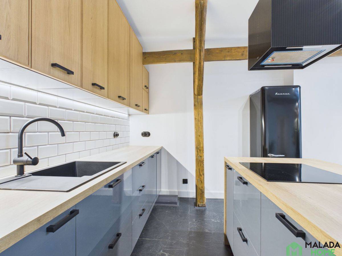 Kuchnia została w pełni wyposażona w wysokiej klasy sprzęt Samsung oraz stylową lodówkę w klimacie retro/vintage,a elegancka zabudowa wykonana na zamówienie doskonale dopełnia wnętrze, łącząc funkcjonalność z ponadczasowym designem.