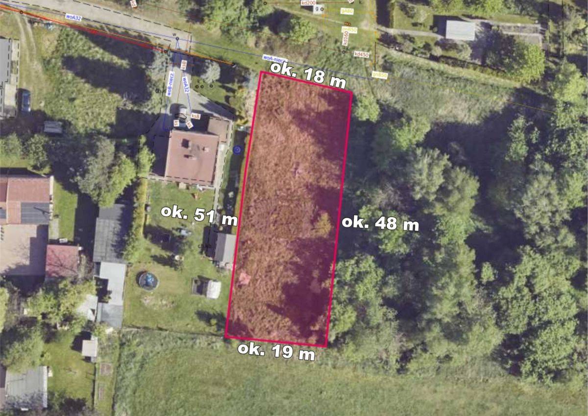 Działka ma kształt zbliżony do prostokąta o orientacyjnych wymiarach ok. 48,5 m długości i 19 m szerokości, co daje dużą swobodę przy planowaniu zabudowy.