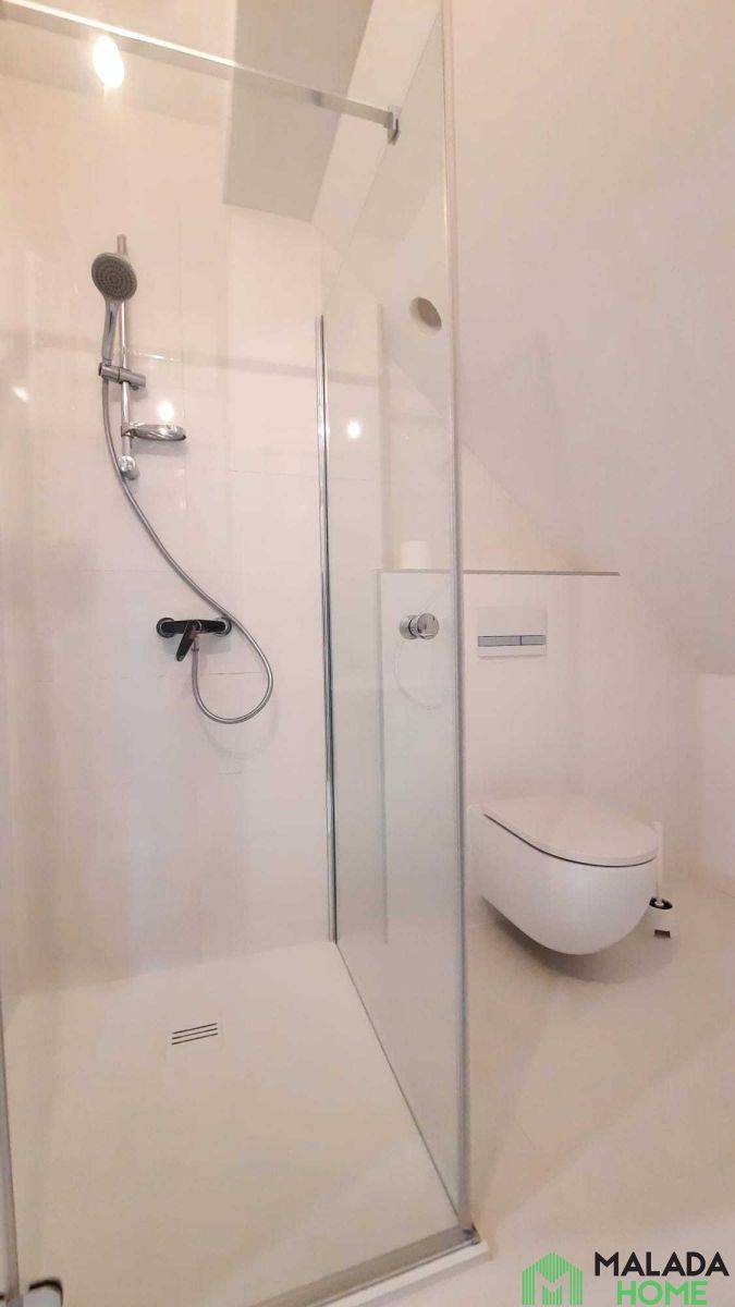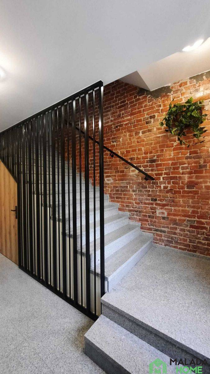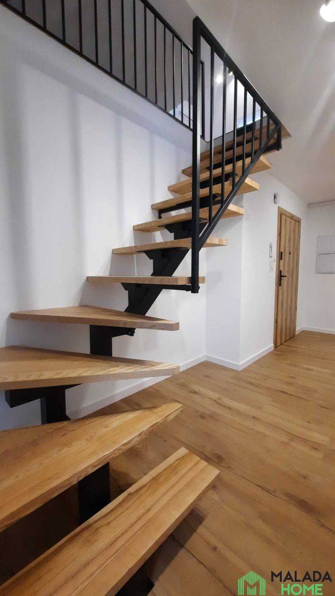 Apartament jest dwupoziomowy, na wyższą kondygnację prowadzą solidne i stylowe schody, co nadaje wnętrzu uroku. W kuchni i łazience użyto materiałów wysokiej jakości.
