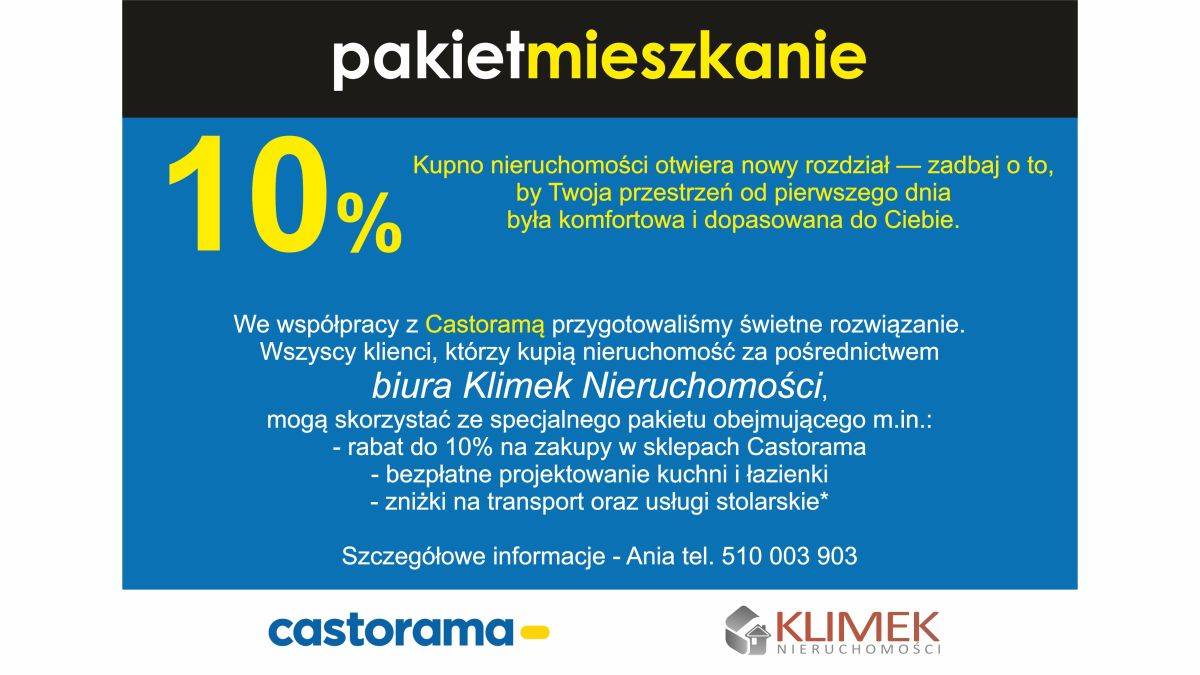 Dlatego klienci Klimek Nieruchomości, którzy kupią z nami nieruchomość, mogą skorzystać ze specjalnego pakietu dzięki naszej współpracy z Castoramą, obejmującego m.in.: