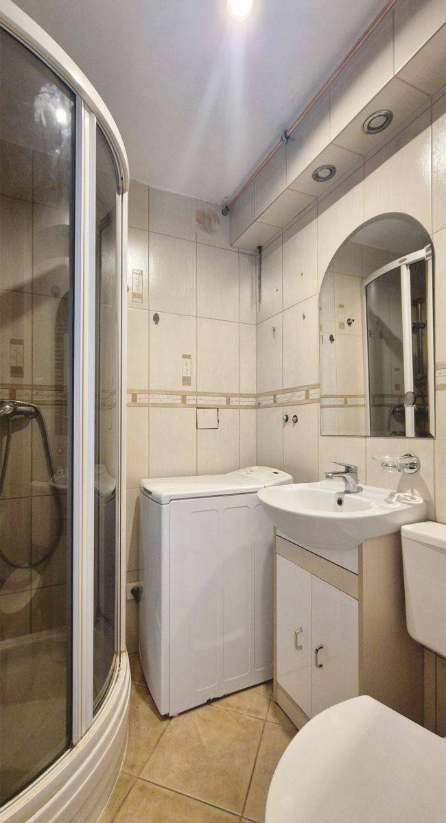 Łazienka wyposażona jest w kabinę prysznicową - funkcjonalne rozwiązanie idealne do kawalerki.
