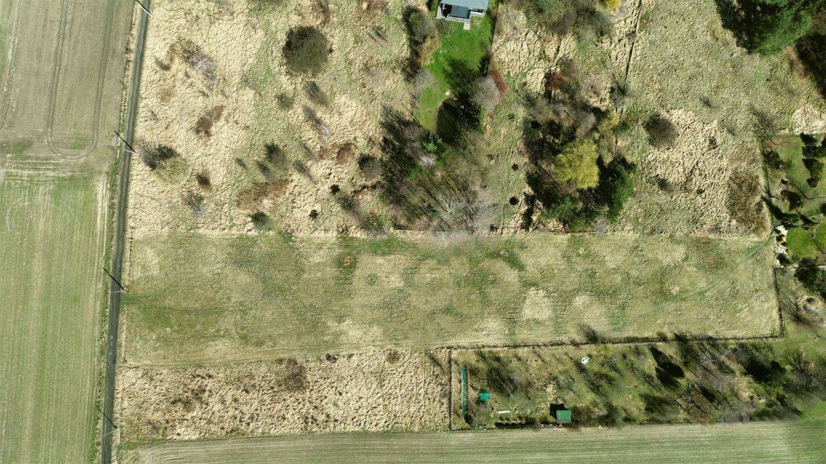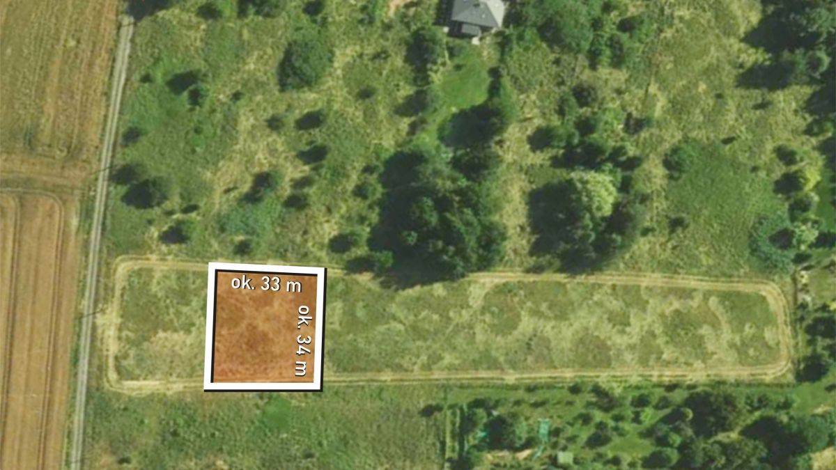 Działka ma kształt niemal kwadratowy, o wymiarach ok. 33 m × 34 m, co pozwala na swobodną aranżację ogrodu i budowę domu zgodnie z własnymi planami.