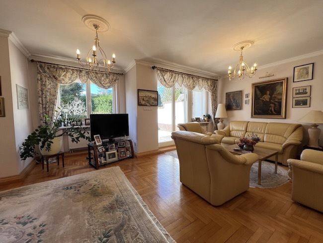 przestronny, jasny salon z kominkiem i wyjściem na pięknie zagospodarowany ogród, -