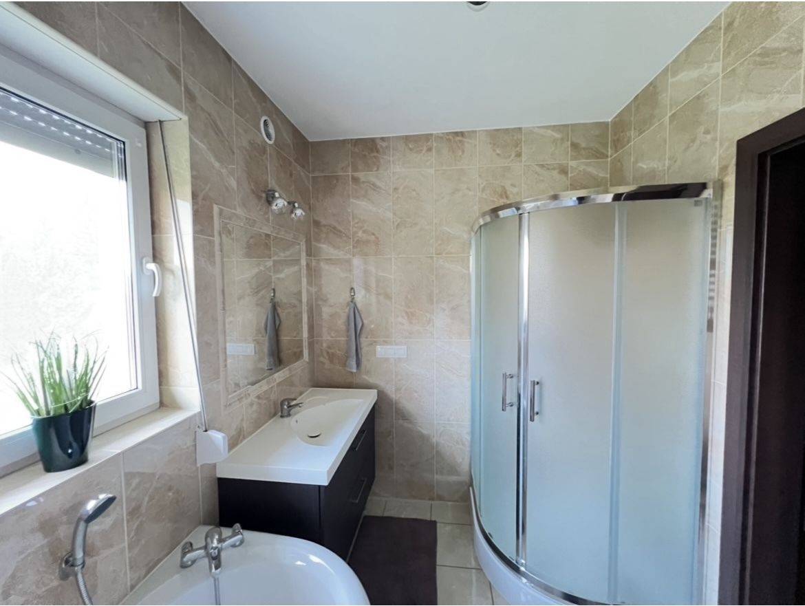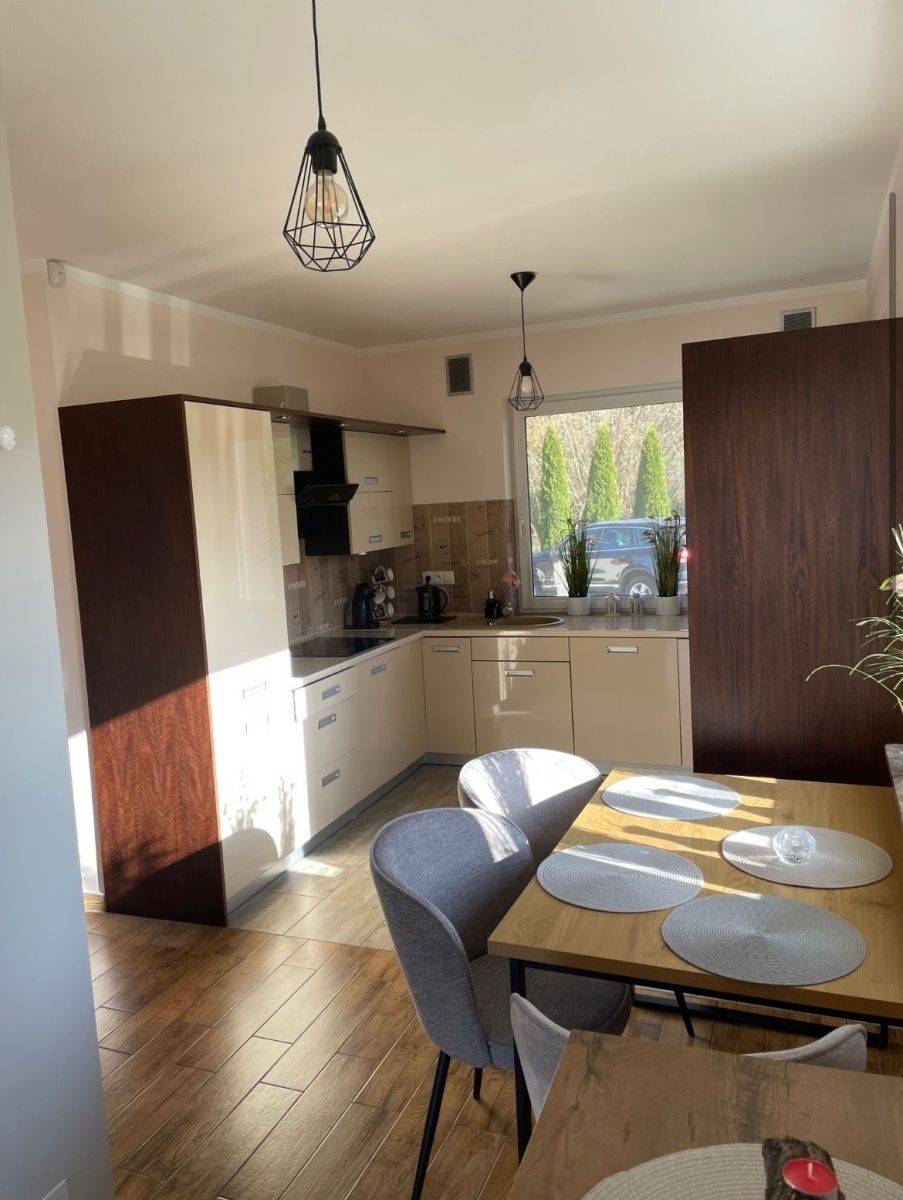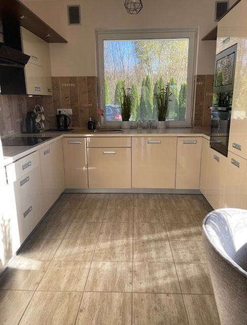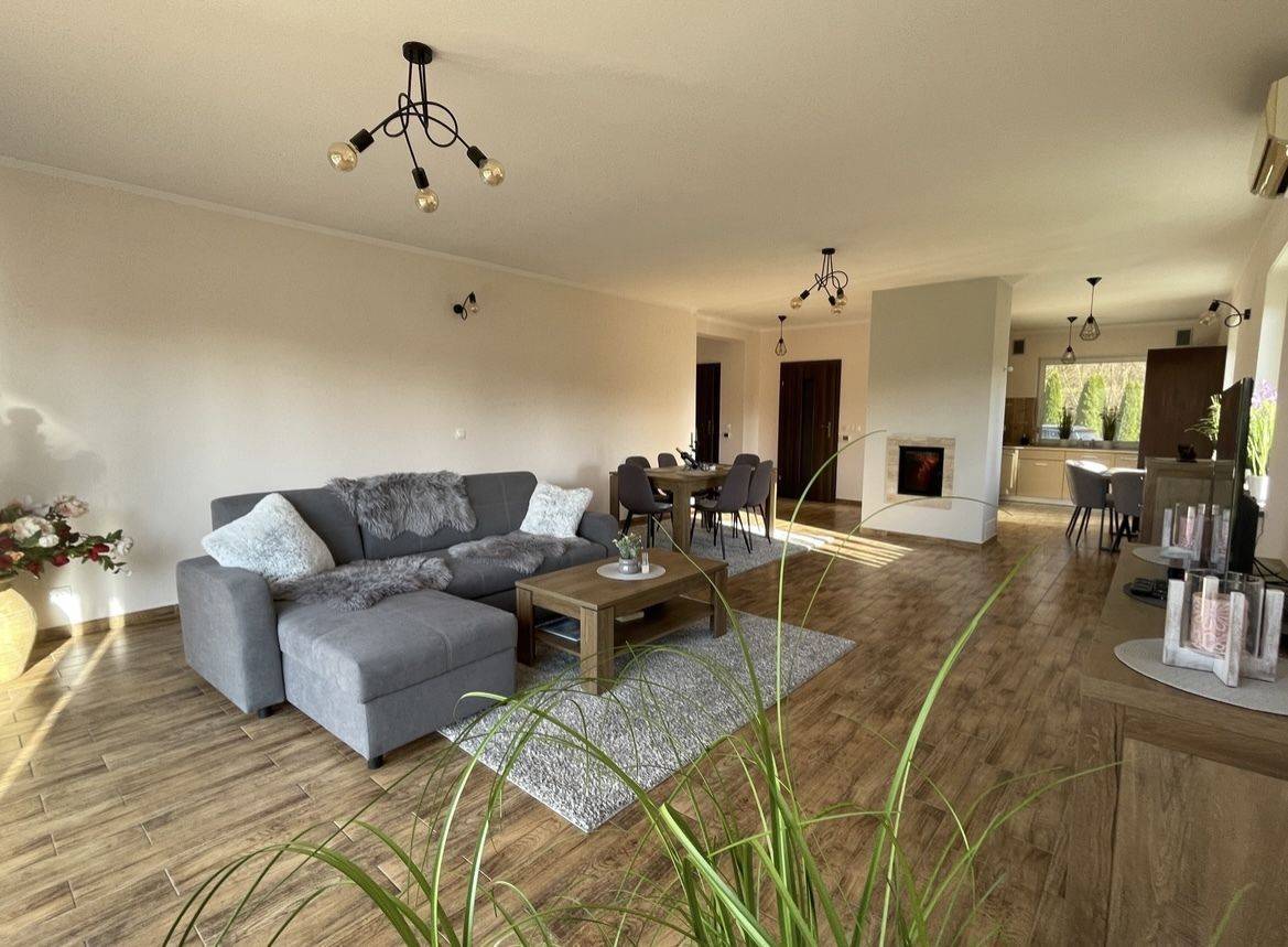 PODŁOGI: w salonie, kuchni, łazienkach, korytarzu i pomieszczeniu gospodarczym - płytki, w pokojach panele podłogowe. INSTALACJE: ogrzewanie podłogowe (maty grzewcze) na całej powierzchni parteru ( każde pomieszczenie ma osobny sterownik temperatury), kominek z funkcją pieca - ogrzewa salon oraz doprowadza ciepło do pozostałych pomieszczeń (system CEBUD z modułami akumulacyjnymi. Klimatyzacja z funkcją grzania w salonie. Własna studnia (32 m) ze stacją uzdatniania wody, szambo ekologiczne, instalacja alarmowa w całym domu i garażu.
