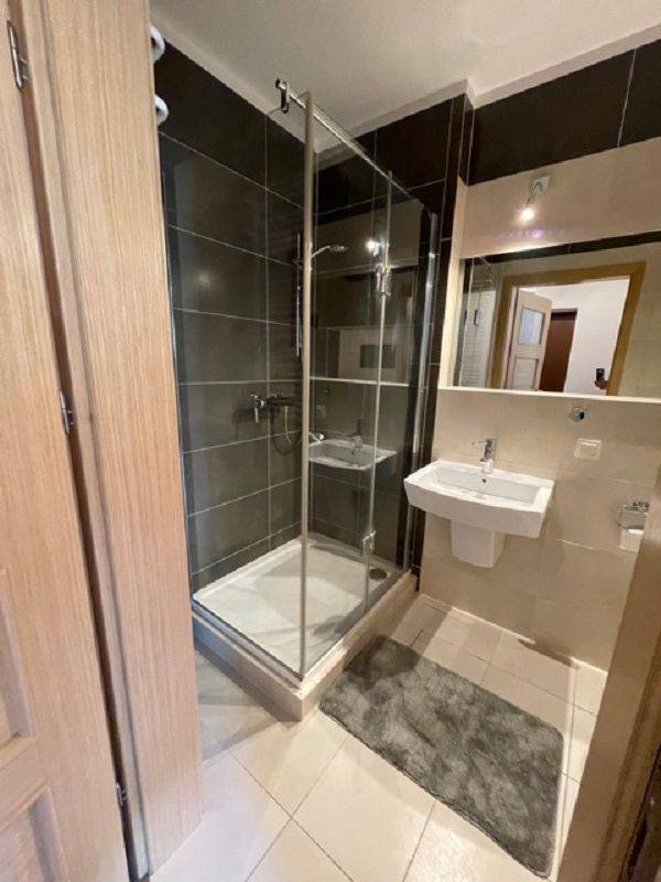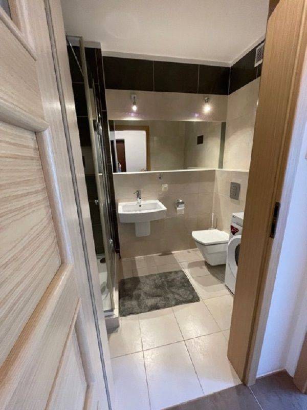 W łazience płytki ,kabina prysznicowa i pralka.W korytarzu szafa komandor i szafka na buty.