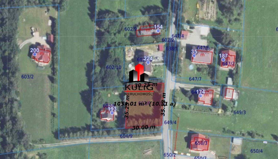 Działka o kształcie kwadratu 30m/35m , wjazd od drogi gminnej asfaltowej, działka równa nieogrodzona, wokół działki rosną drzewa.