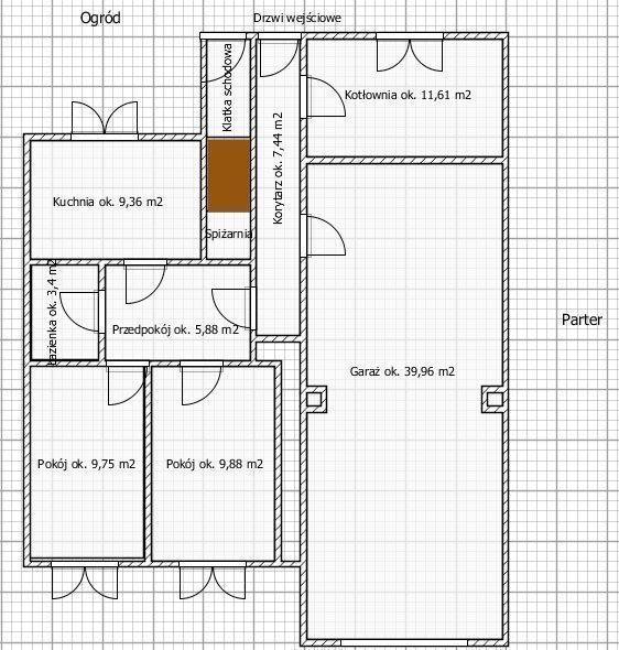 Parter domu: 2 pokoje, kuchnia, łazienka, spiżarnia, przedpokój, kotłownia, garaż, korytarz, klatka schodowa.