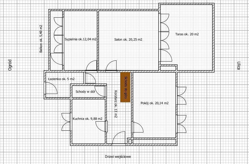 Drugie piętro: 2 pokoje, klatka schodowa, 2 pomieszczenia strychowe (z większego pomieszczenia wejście na strych u góry).